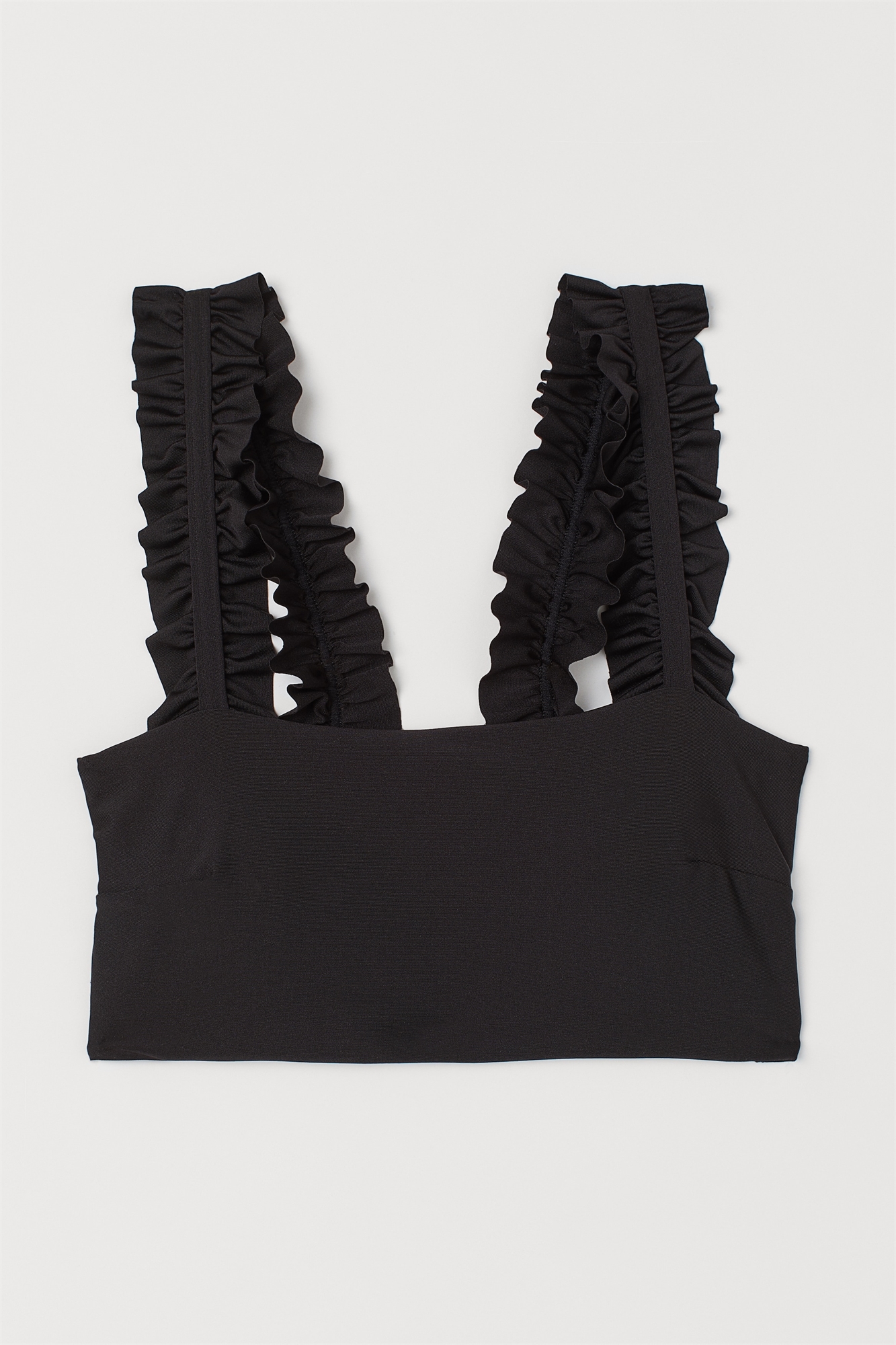 Бикини с мягкими чашечками и заниженной талией. Топ имеет широкие бретели с воланами и чашечки со съемными вставками, которые придают бюсту форму и хорошо поддерживают. Без застежки.
