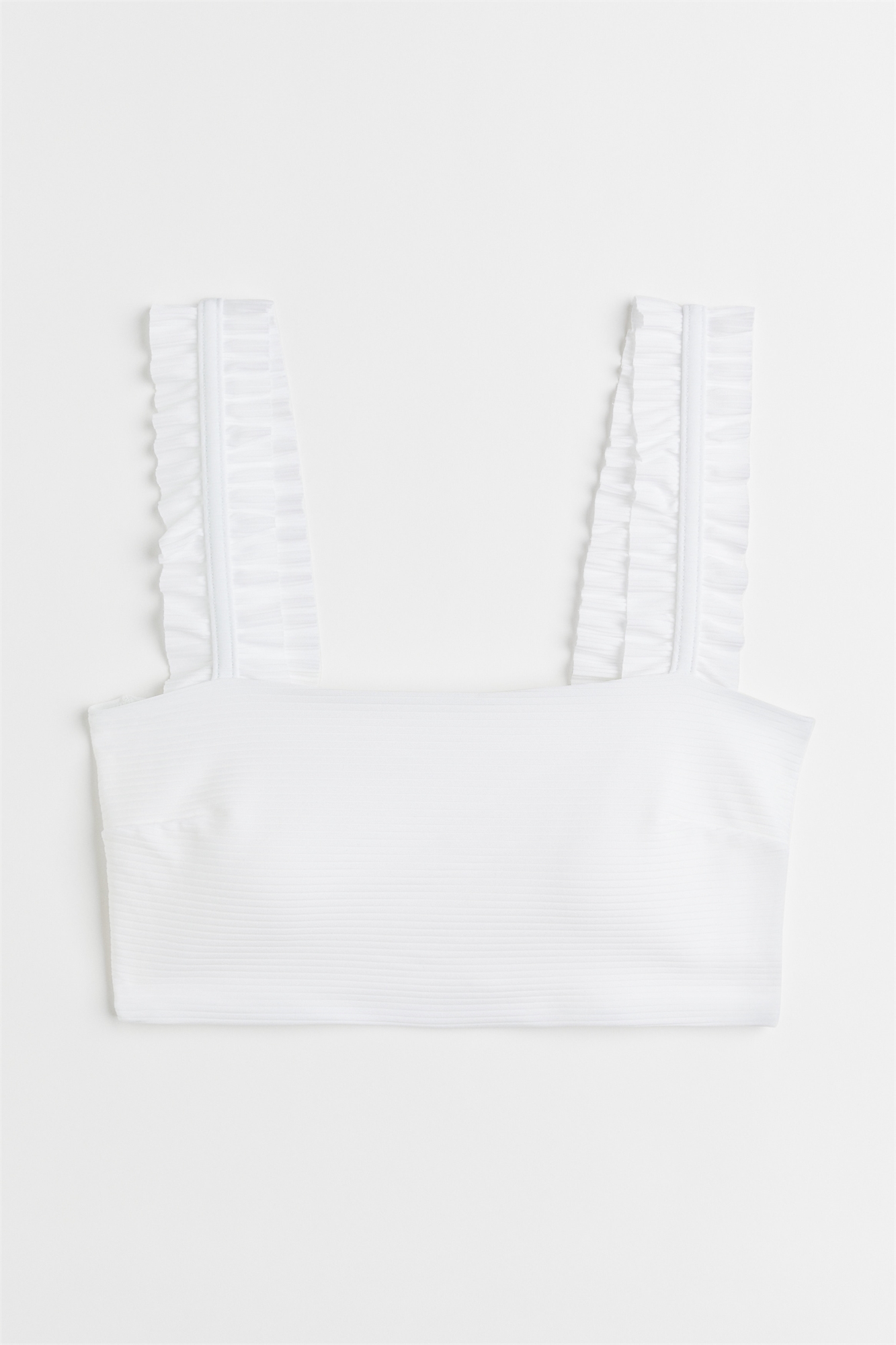 Бикини с мягкими чашечками и заниженной талией. Топ имеет широкие бретели с воланами и чашечки со съемными вставками, которые придают бюсту форму и хорошо поддерживают. Без застежки.