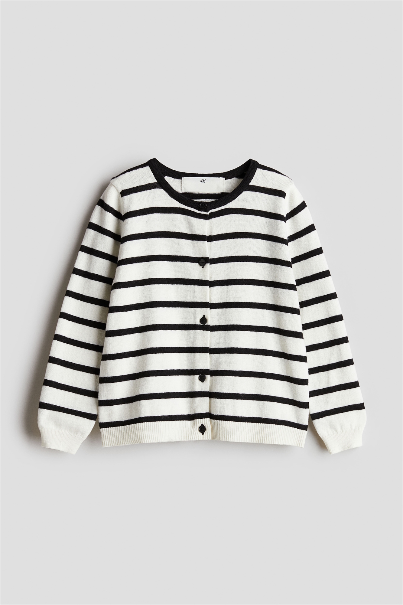 Кардиган из мягкого хлопка тонкой вязки с пуговицами спереди, прямым подолом и окантовкой по вырезу горловины, манжетам и подолу.