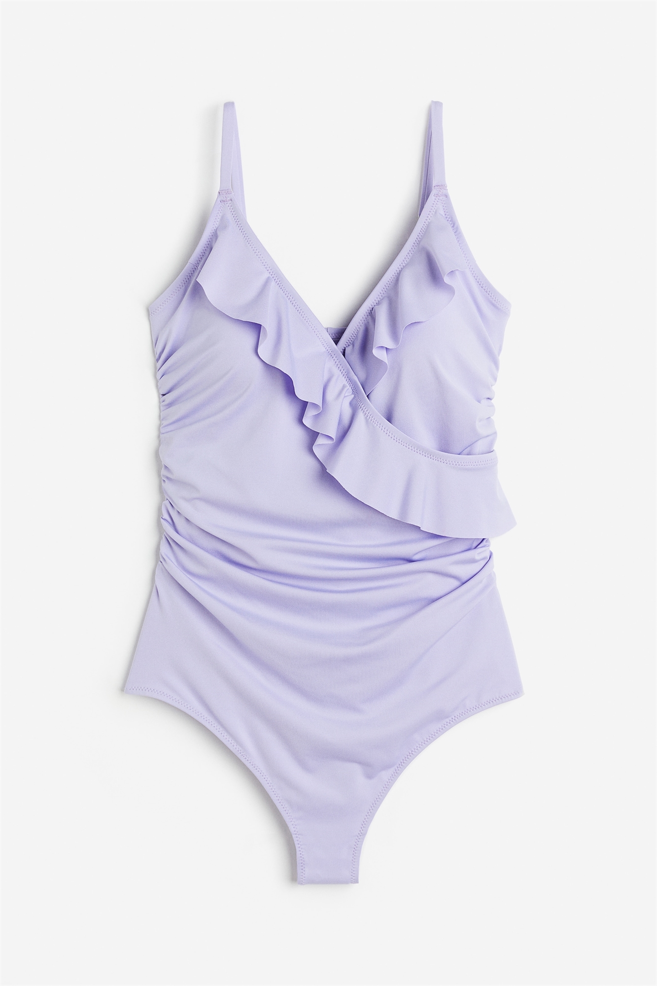 Полностью на подкладке, купальник с V-образным вырезом, облегающий талию и придающий ей форму. Узкие регулируемые бретели, мягкие чашечки, придающие форму бюсту и обеспечивающие хорошую поддержку, и пришитый волан спереди. Сборки по бокам для эффекта драпировки и средняя степень защиты сзади.