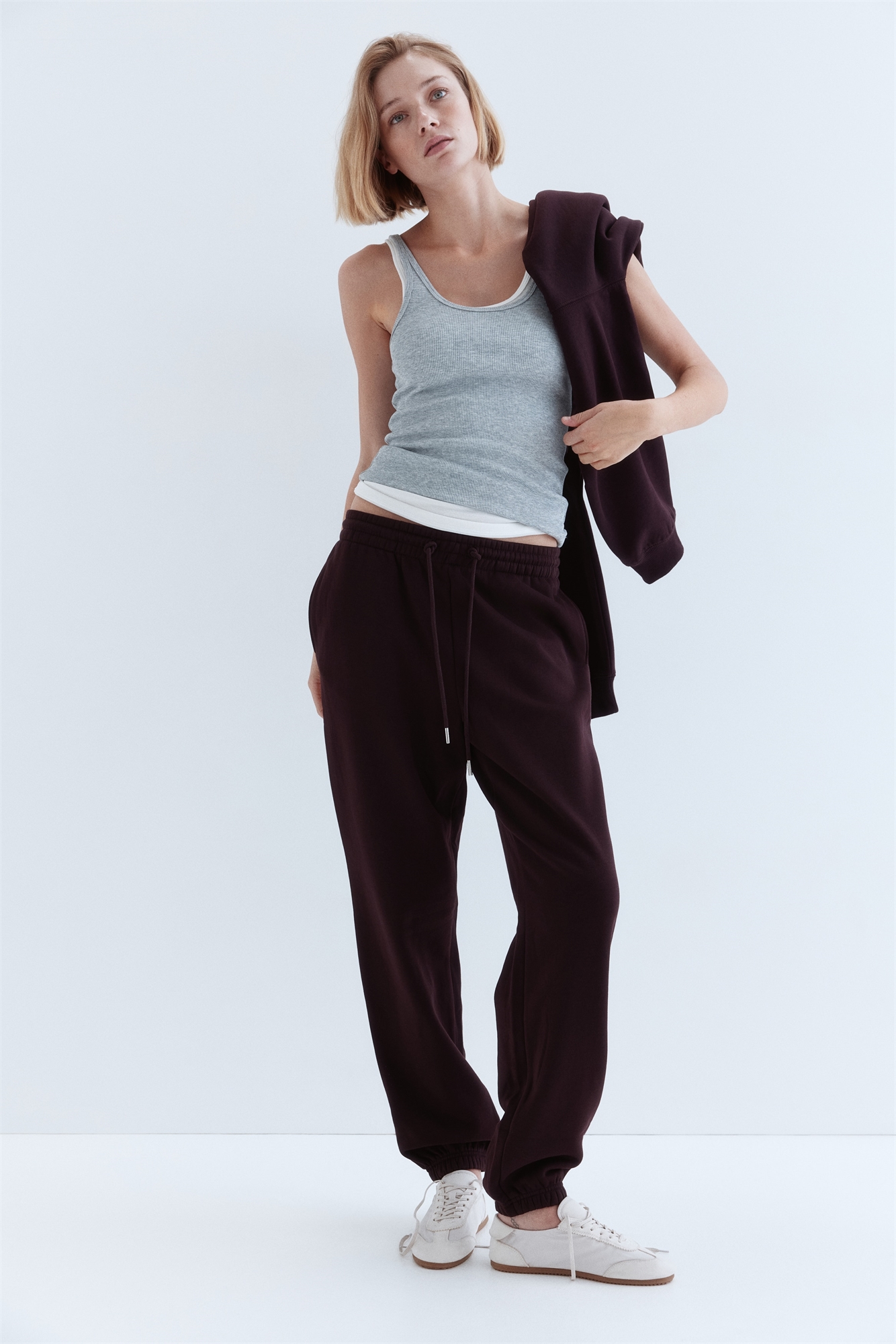 Тренировочные брюки из мягкой ткани из смеси хлопка. Высокая талия с утяжкой и эластичным поясом, боковые карманы и утяжка по краям. Мягкая начесанная внутренняя сторона.