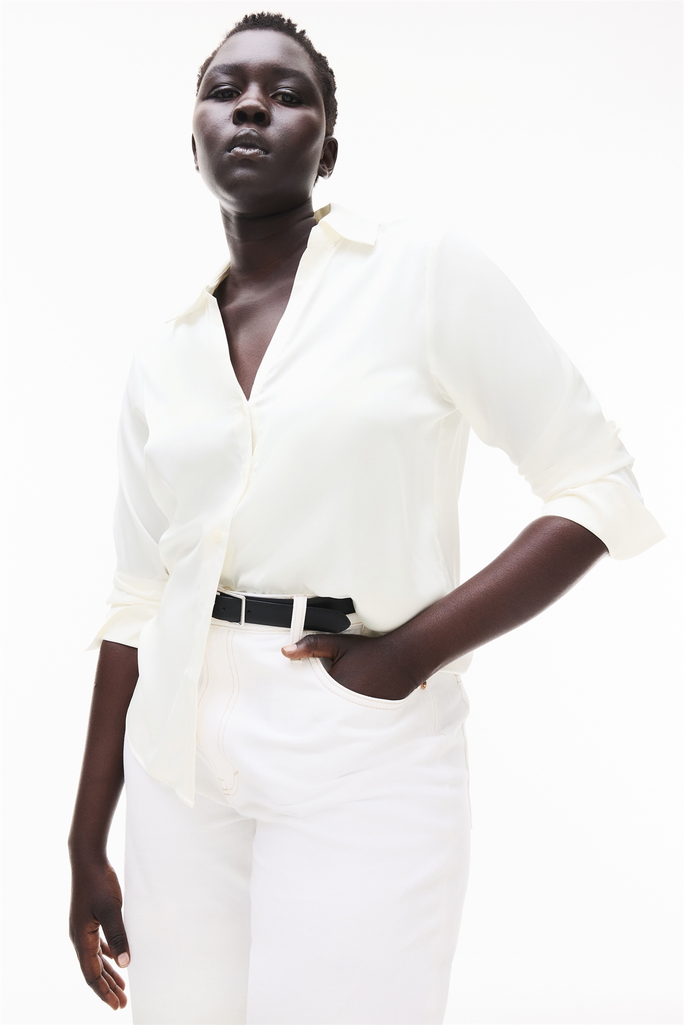 Блузка с V-образным вырезом из тканого материала с блеском. Воротник, застежка на пуговицы спереди, длинные рукава с рукавной планкой и манжетами на пуговицах, закругленный подол.