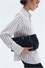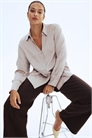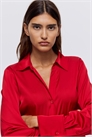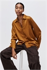 Блузка с V-образным вырезом из тканого материала с блеском. Воротник, застежка на пуговицы спереди, длинные рукава с рукавной планкой и манжетами на пуговицах, закругленный подол.