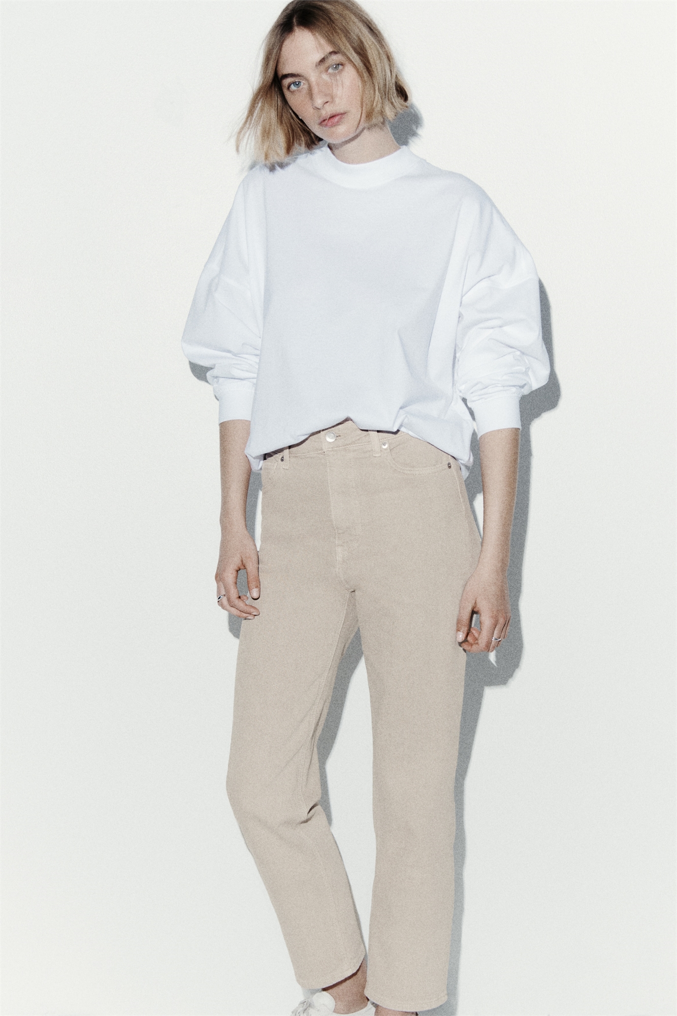 Джинсы с 5 карманами из денима с легким стретчем для комфорта. Прямые штанины с зауженной посадкой от бедра до бедра, сужающейся к подолу. Высокая талия с ширинкой на молнии и пуговице. Длина по щиколотку, рассчитанная на посадку в районе лодыжки.