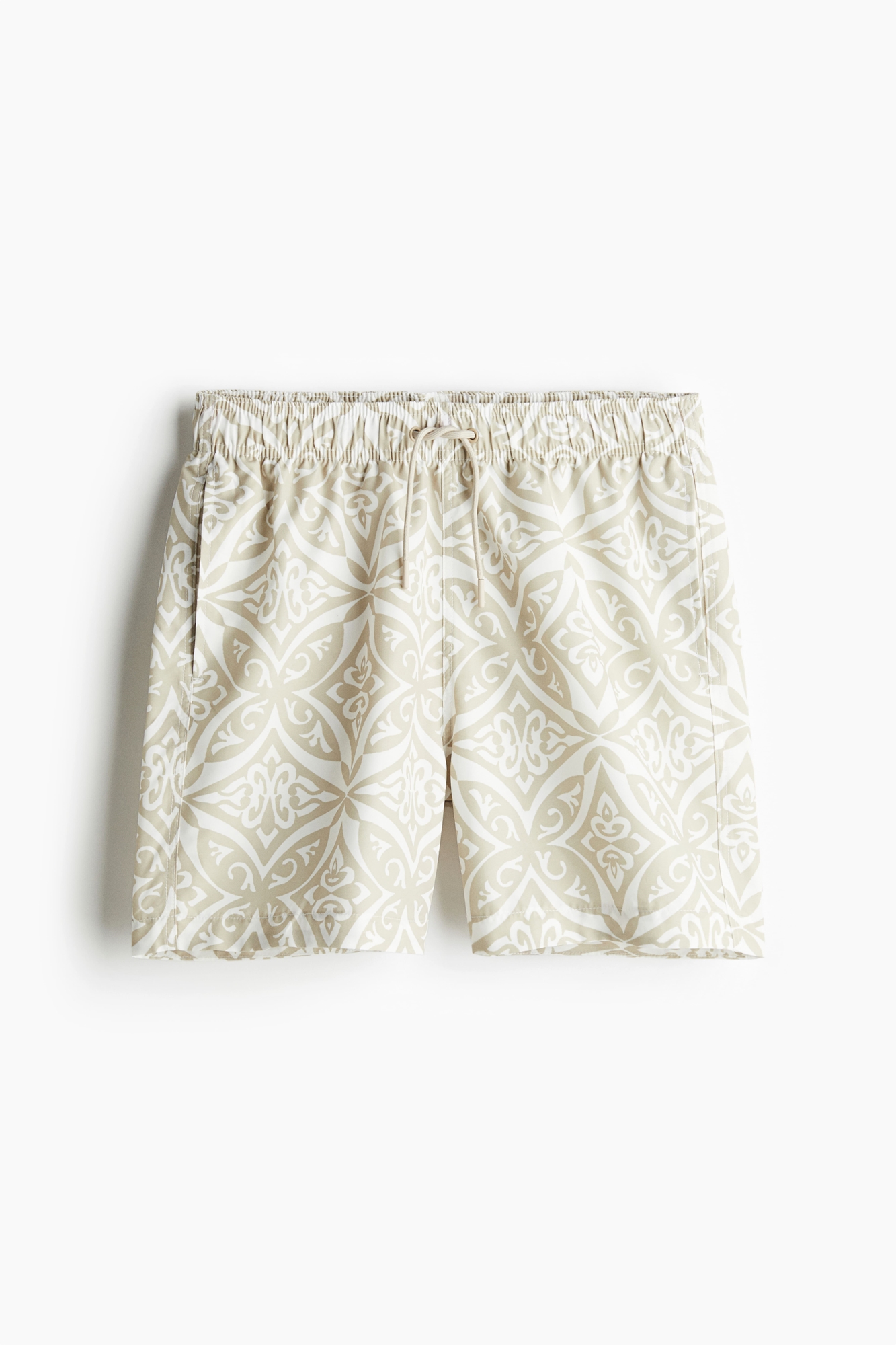Шорты для плавания с узорчатым плетением, эластичным материалом и завязкой на талии, боковыми карманами, накладным задним карманом с застежкой на крючок и петлю и ногами, заканчивающимися над коленями. Внутренние шорты из мягкой сетки.