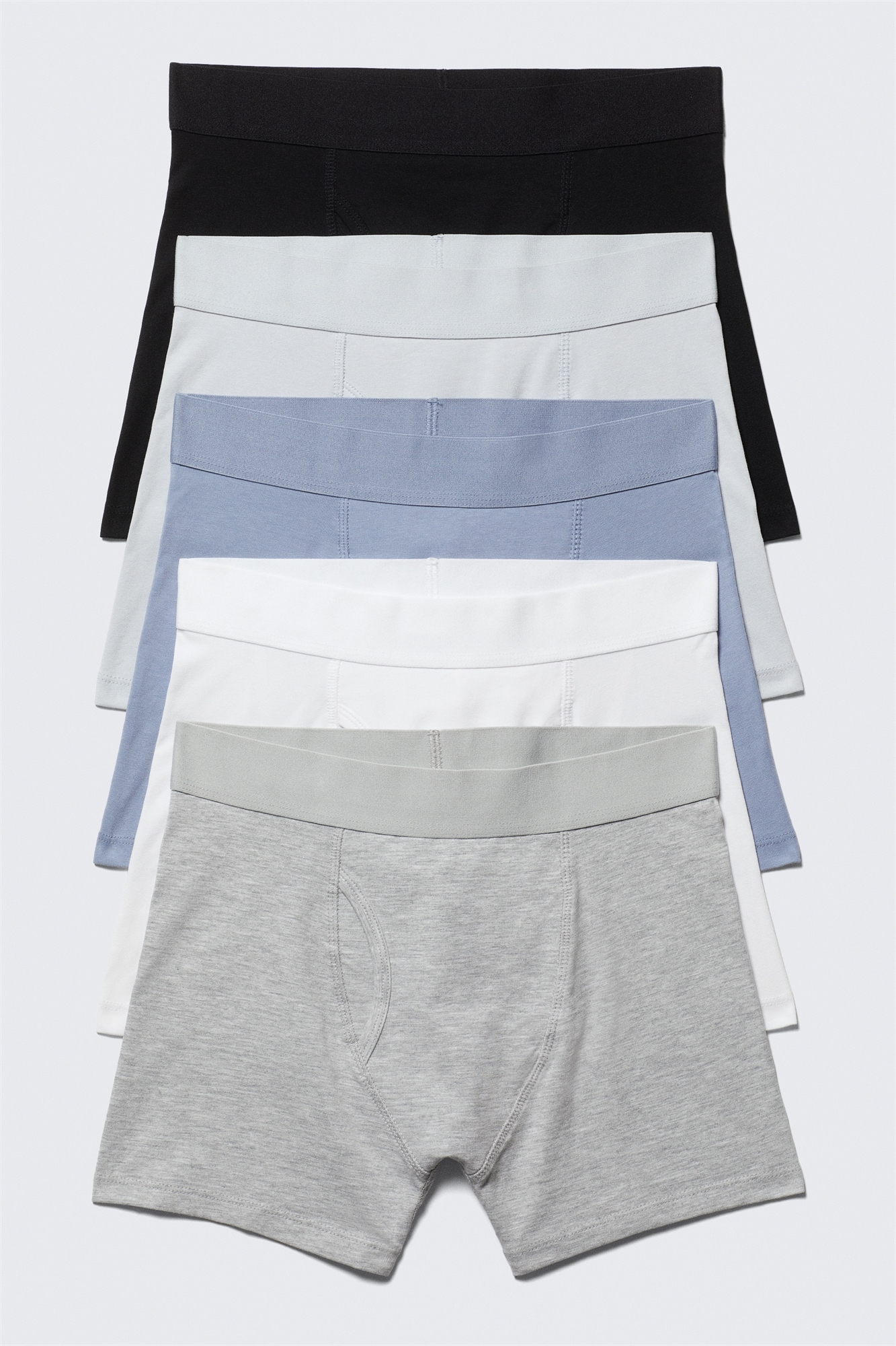 Упаковка из пяти пар мужских трусов-боксеров из органического хлопка с добавлением эластана для дополнительного комфорта и эластичности. Они имеют удобный однотонный эластичный пояс и гладкую строчку с плоским замком. Размер 70 см в обхвате талии и около 4 см в штанине.