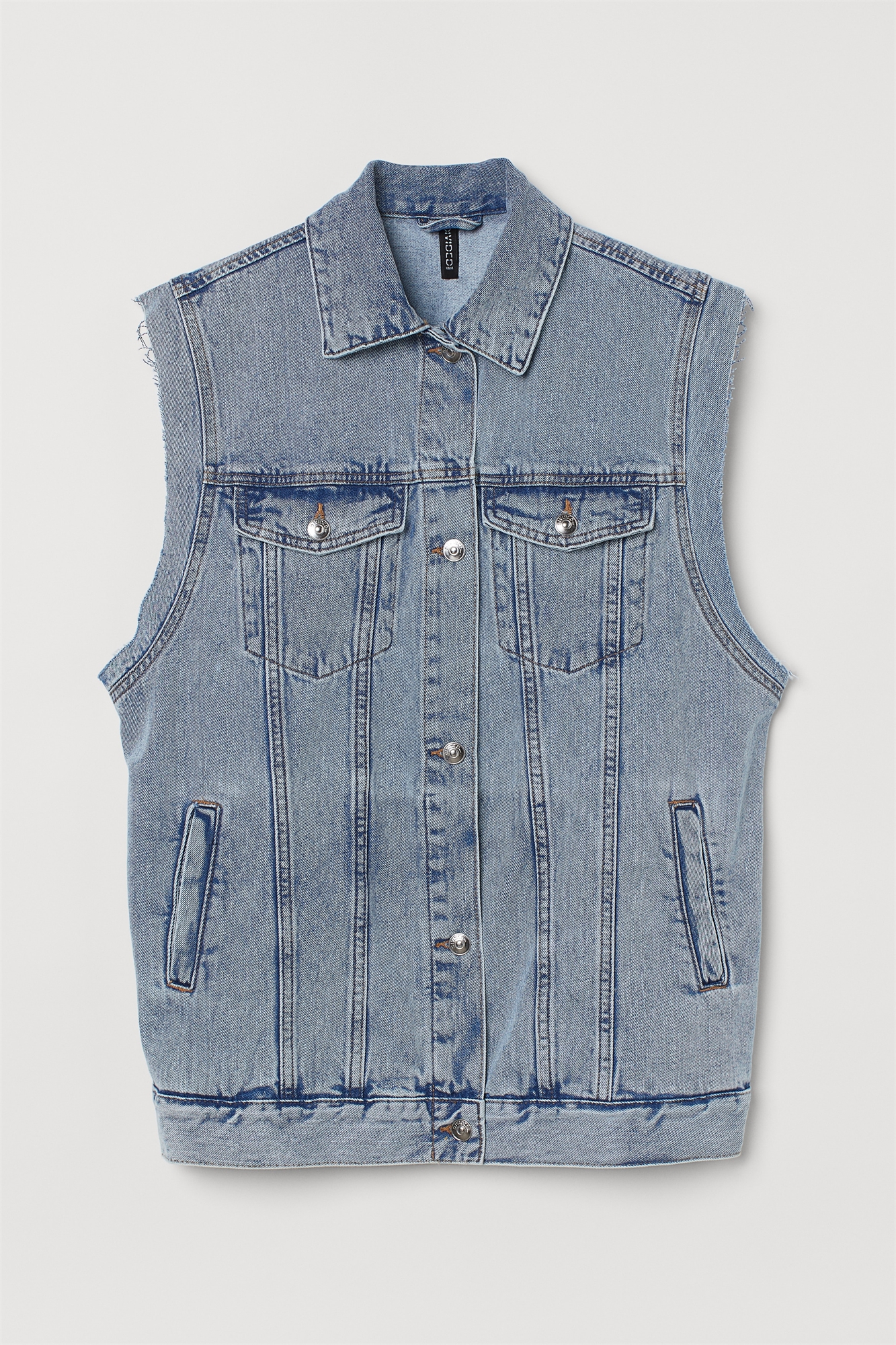 Жилет из стираного хлопкового денима с воротником и пуговицами спереди. Модель с подчеркнутыми плечами и проймами с открытыми краями. Плечевые ярмо и швы спереди и сзади. Нагрудные карманы на пуговицах с клапанами и накладные карманы спереди. Регулируемая закладка на пуговицах на заднем подоле.