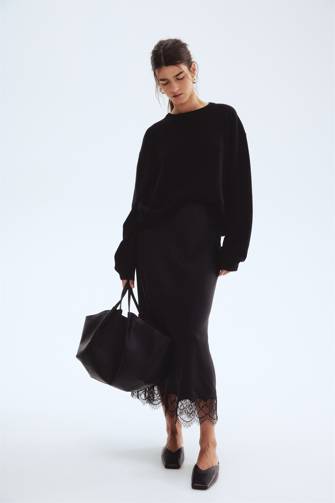 Джемпер из мягкого кашемира тонкой вязки с круглым вырезом в рубчик. Свободный крой с опущенными плечами, удлиненными рукавами и окантовкой манжет и подола. Закругленные и слегка удлиненные сзади.