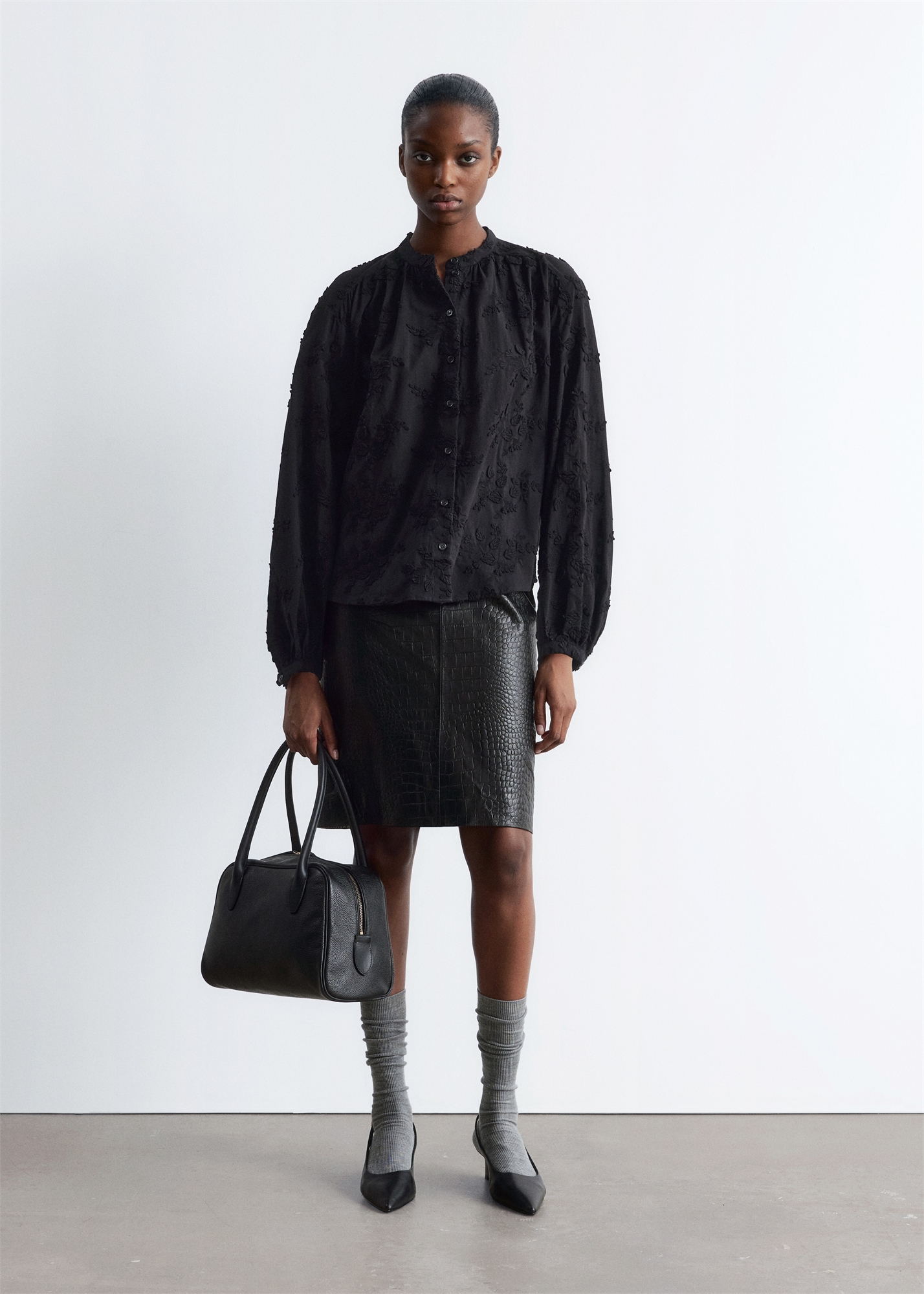 Объемная блузка с воротником-стойкой, цветочной аппликацией и длинными рукавами с манжетами. • Свободный силуэт • Изогнутая линия подола • Длина блузки: 64,6 см / 25,4 дюйма (EU 36 / UK 10 / US 4)
