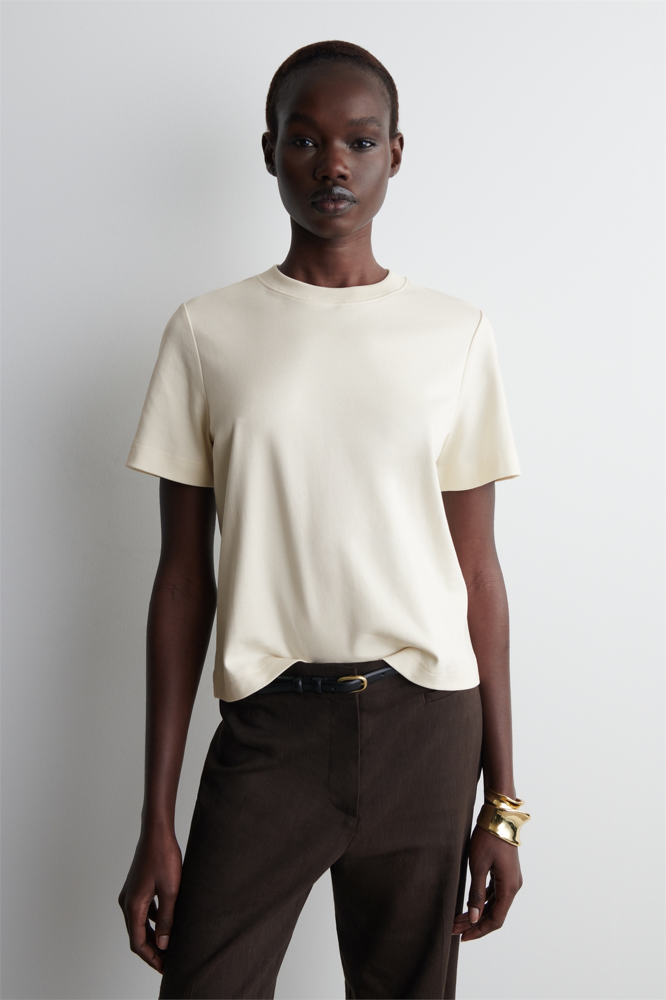 Классическая футболка получила современное обновление в виде неокрашенной ткани. Изготовленная из супермягкого органического хлопка натурального оттенка, она имеет свободный крой и контрастный воротник для современного образа. Круглый вырез Короткие рукава Органический хлопок выращен из негенетически модифицированных семян без использования химических удобрений и пестицидов 100% органический хлопок / Машинная стирка Длина по спинке для размера S составляет 54,2 см / Рост модели 176 см, носит размер S