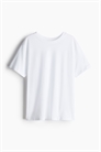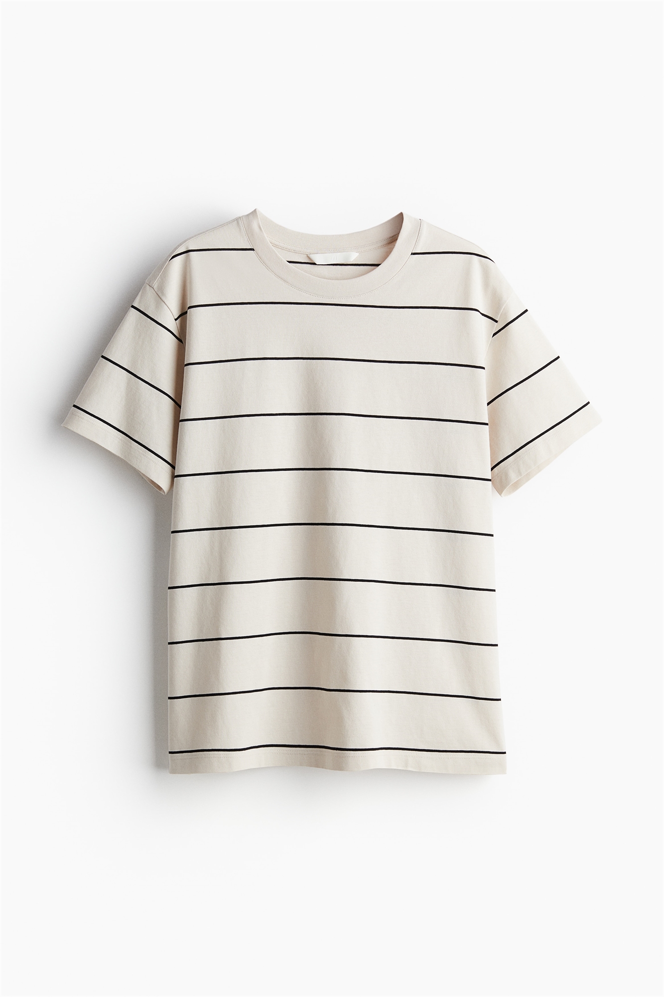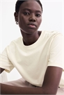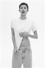 Футболка прямого кроя из мягкого хлопкового джерси. Футболка имеет круглый вырез с ребристой отделкой и слегка опущенные плечи.