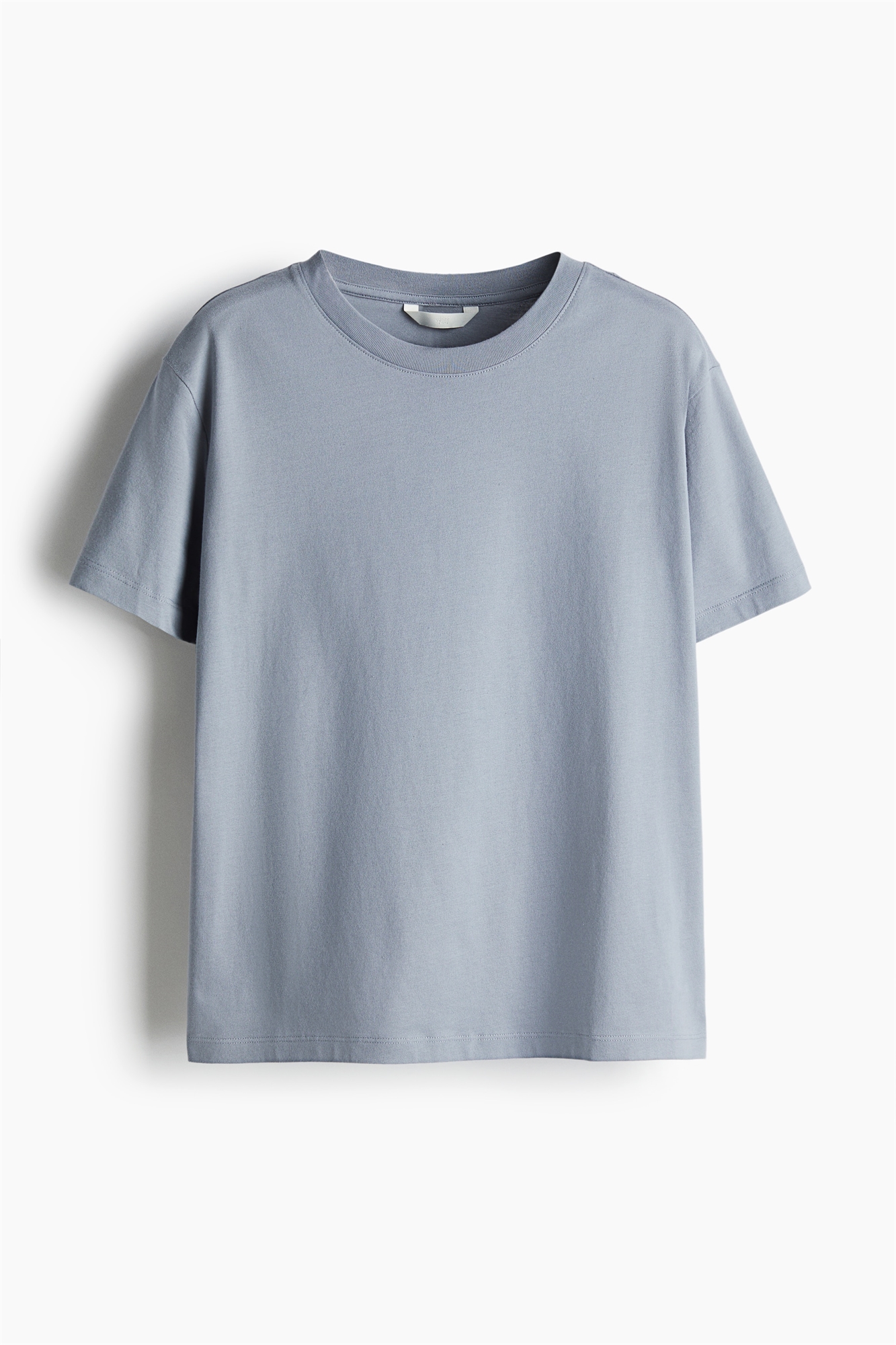 Футболка прямого кроя из мягкого хлопкового джерси. Футболка имеет круглый вырез с ребристой отделкой и слегка опущенные плечи.