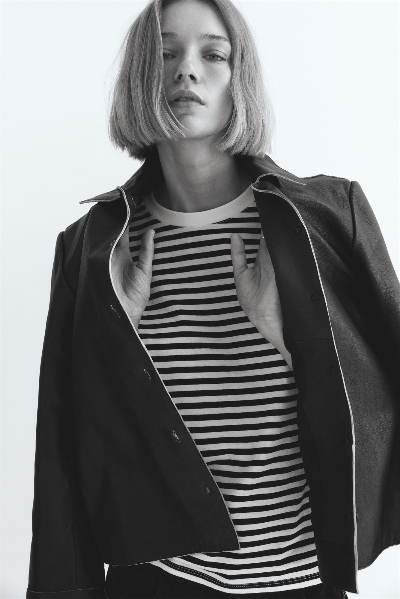 Футболка прямого кроя из мягкого хлопкового джерси. Футболка имеет круглый вырез с ребристой отделкой и слегка опущенные плечи.