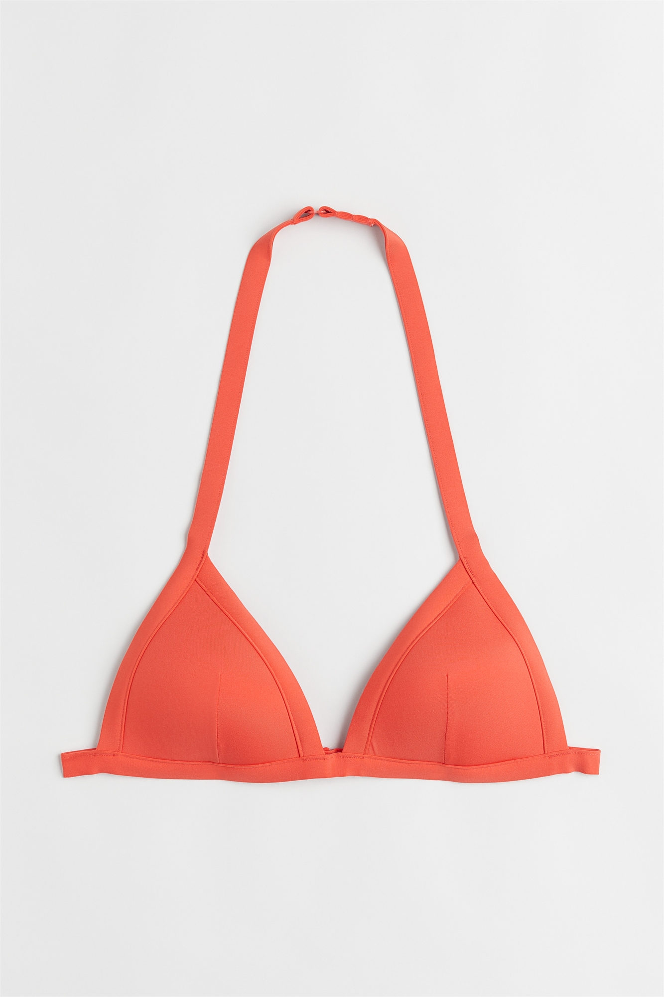 Бикини-треугольник с подкладкой и ребристыми чашечками с мягкими чашечками, которые делают грудь полнее и создают красивое декольте. Бретели на спине и шее с металлической застежкой.