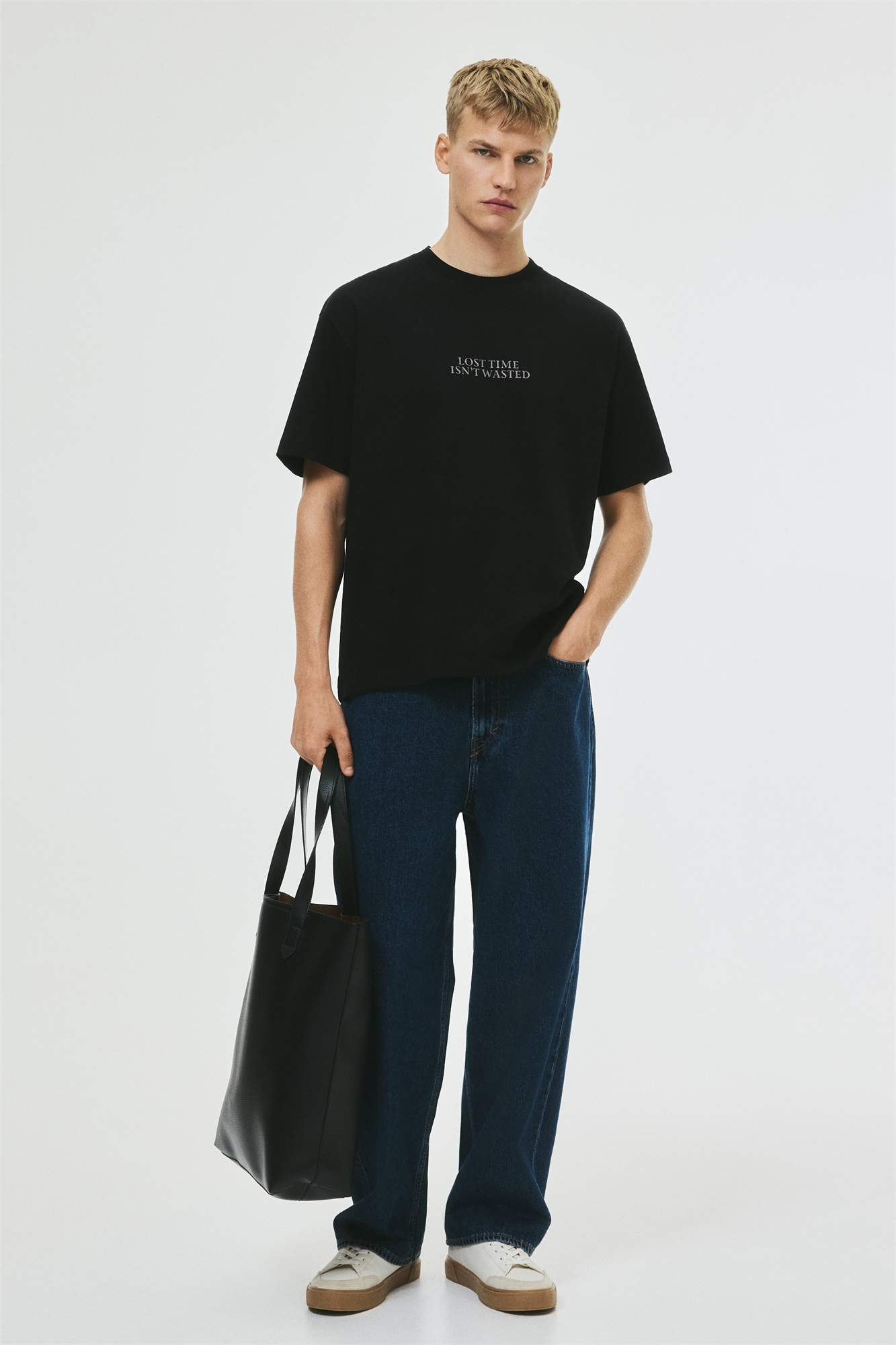 Футболка из хлопкового джерси средней плотности с принтом, круглым вырезом с ребристой отделкой, спущенными плечами и прямым покроем. Свободный крой для объемного, но не чрезмерно большого силуэта.