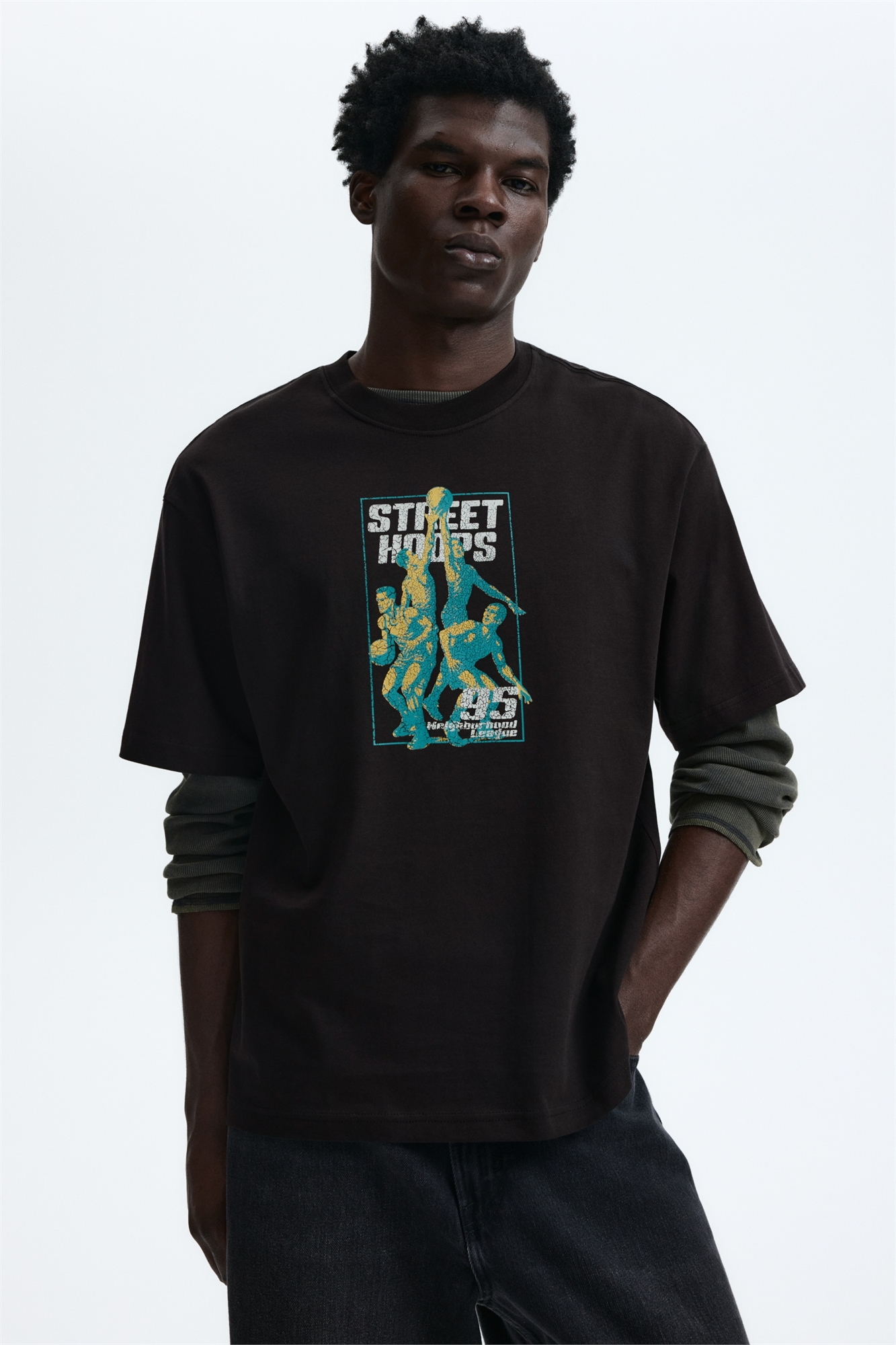 Футболка из хлопкового джерси средней плотности с принтом, круглым вырезом с ребристой отделкой, спущенными плечами и прямым покроем. Свободный крой для объемного, но не чрезмерно большого силуэта.