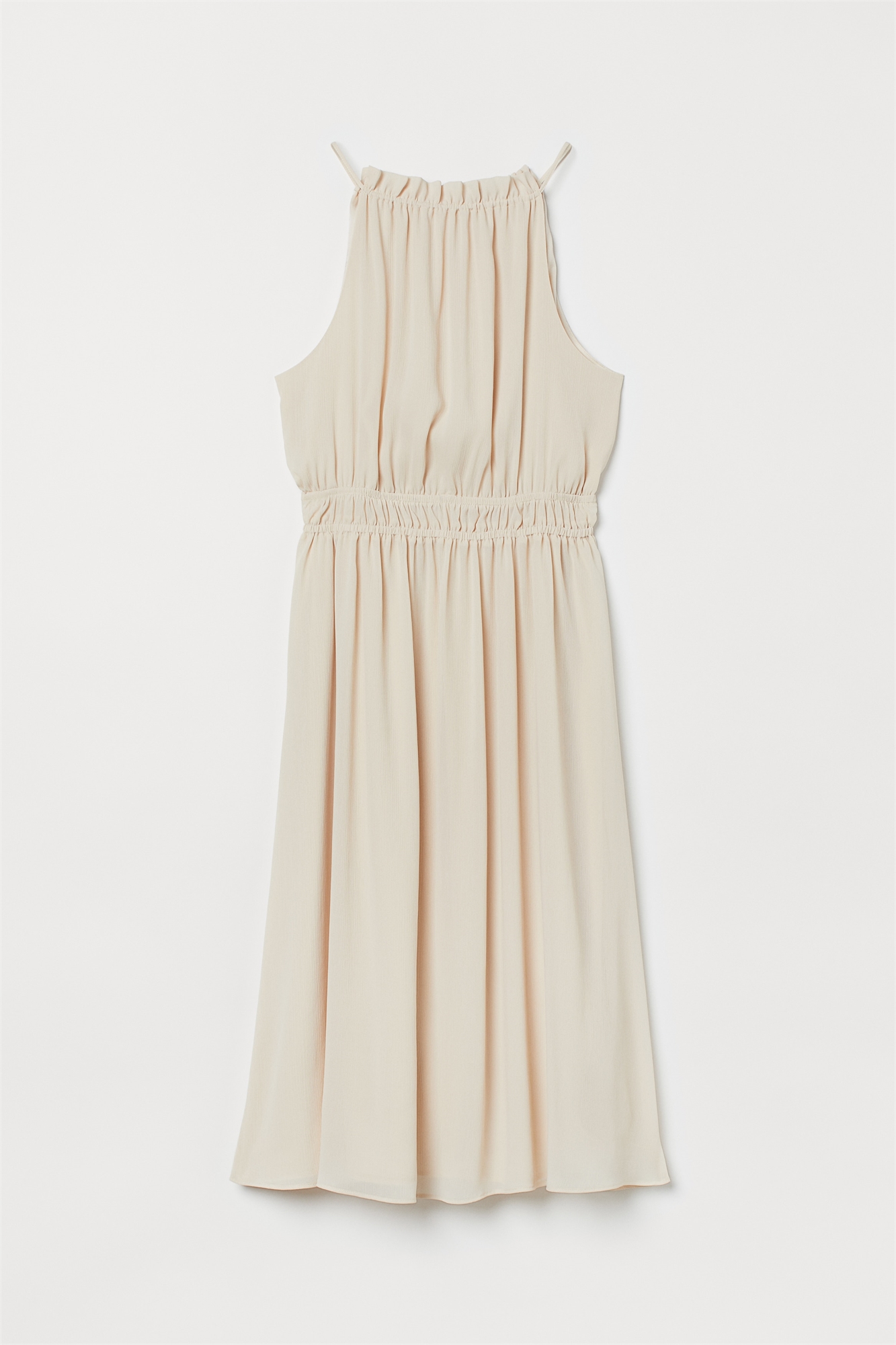 Платье длиной до колена из воздушного тканого материала со складками и воланом в верхней части, короткими бретелями и низким вырезом на спине с закрытой пуговицей на затылке. Две узкие эластичные ленты на талии. Юбка слегка расклешенная. На подкладке.