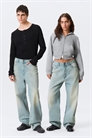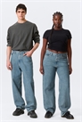 Джинсы со средней посадкой, свободный крой и прямые штанины. Джинсы изготовлены из жесткого денима из органического хлопка с добавлением переработанного хлопка. Они имеют классический дизайн с пятью карманами и застежку-молнию.