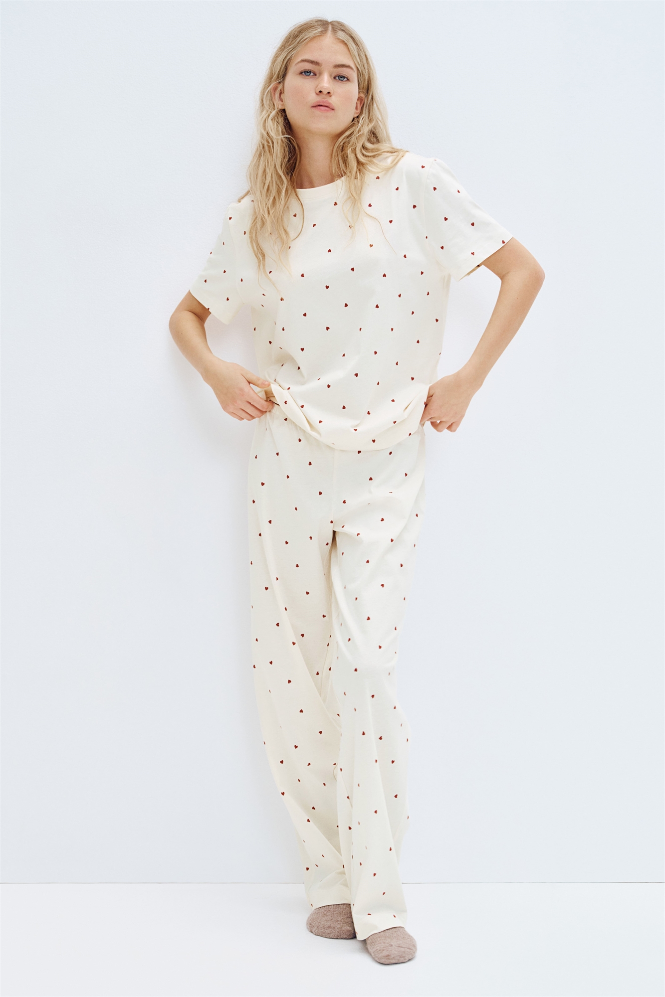 Пижама из узорчатого джерси из смеси хлопка. Верхняя часть в непринужденном стиле, со спущенными плечами, короткими рукавами и разрезами по бокам подола. Низ с эластичной вставкой на талии и манжетами по краям.