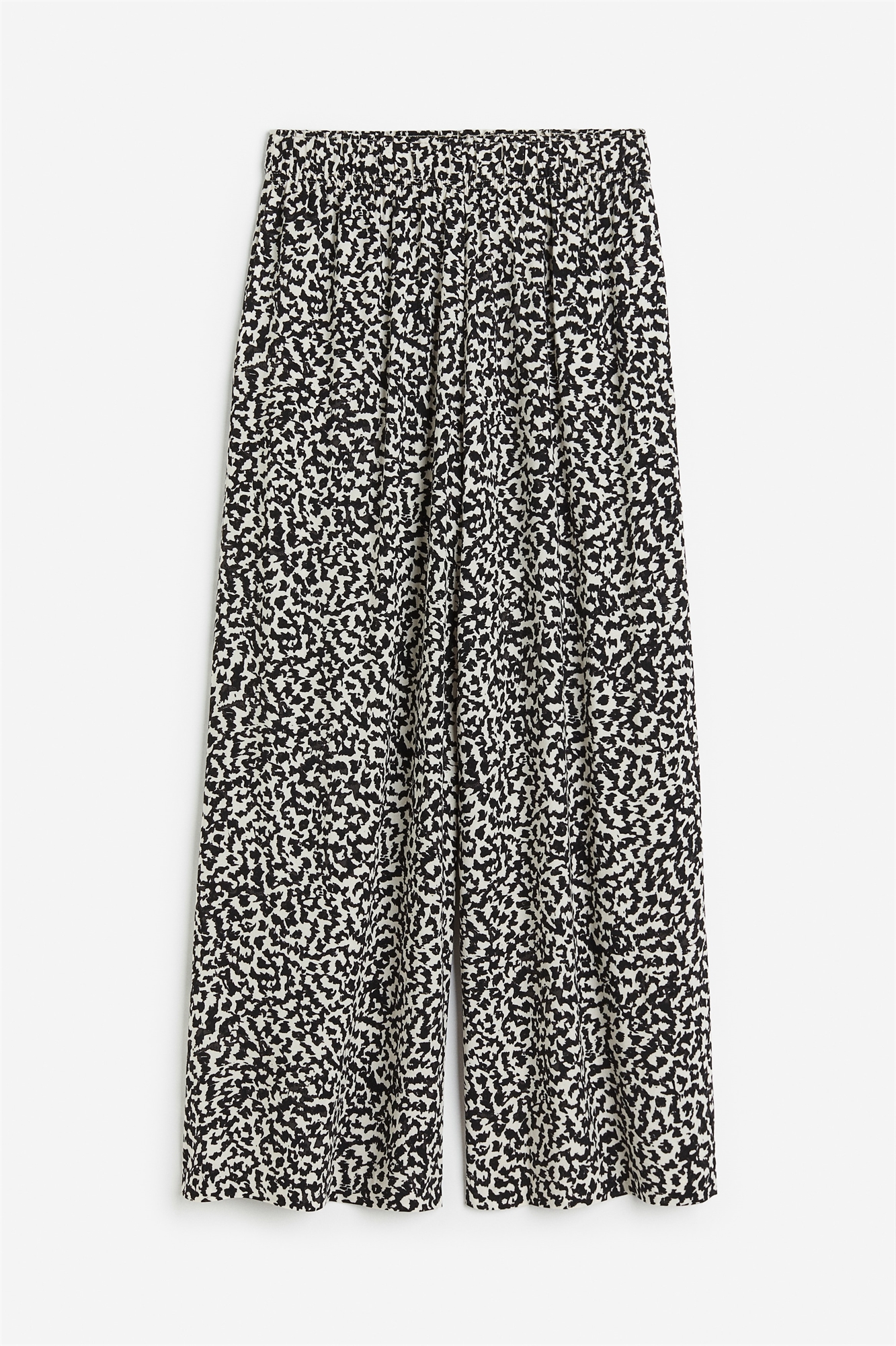 Брюки длиной до щиколотки из мягко драпирующегося вискозного полотна. Высокая талия с утяжкой, незаметные карманы в боковых швах и широкие прямые ноги.