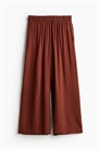 Брюки длиной до щиколотки из мягко драпирующегося вискозного полотна. Высокая талия с утяжкой, незаметные карманы в боковых швах и широкие прямые ноги.