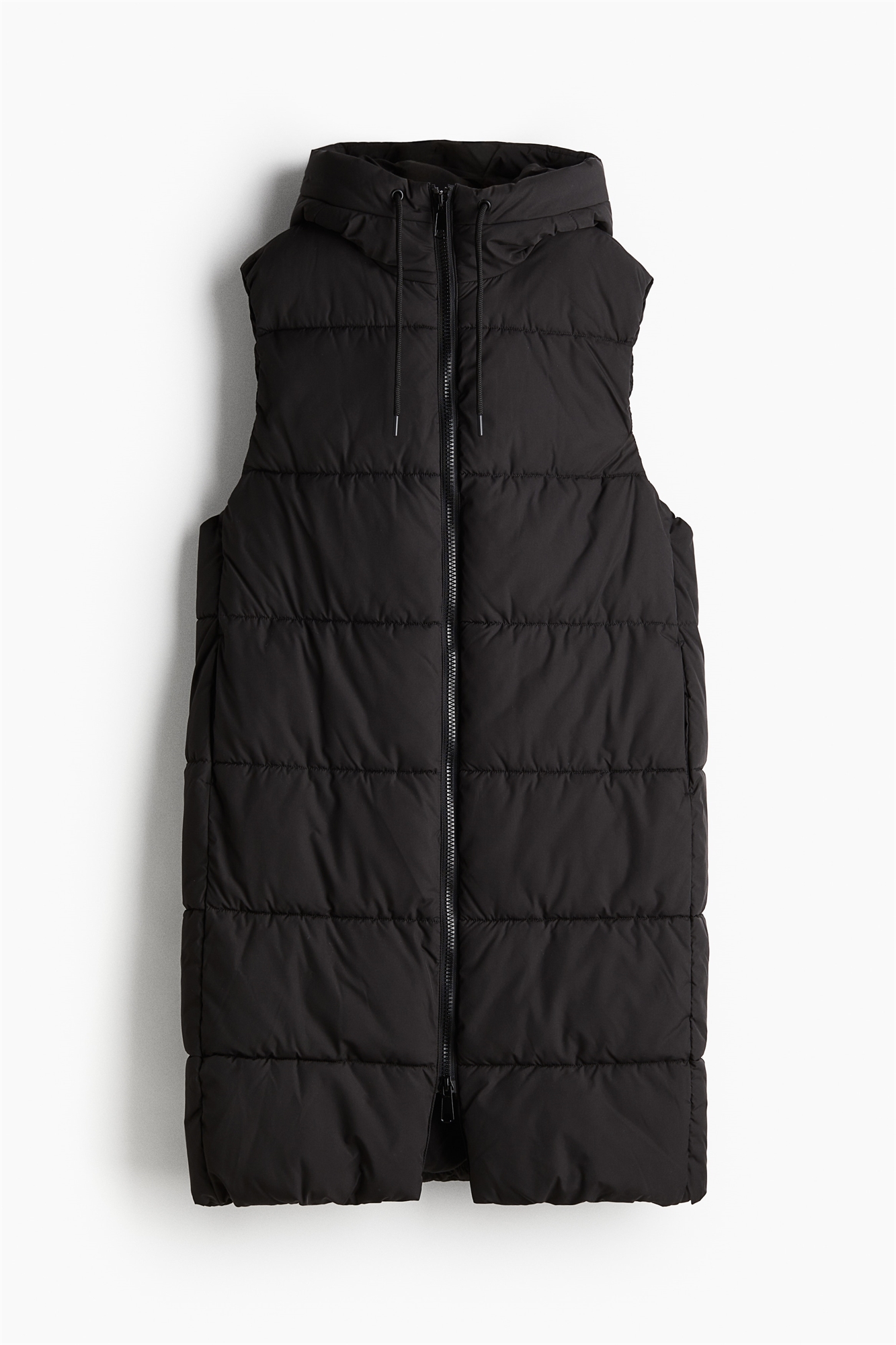Пуховик-жилет длиной до колена из тканого материала со стегаными швами. Свободный крой с практичной двусторонней молнией спереди. Капюшон на завязках и узкая, скрытая эластичная резинка по проймам и подолу. Боковые швы расположены спереди и содержат незаметные карманы. На подкладке.