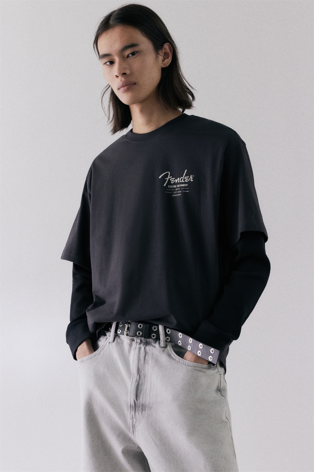 Футболка из мягкого принтованного хлопкового джерси средней плотности, со спущенными плечами и круглым вырезом с узкой окантовкой. Свободный крой для объемного, но не чрезмерно большого силуэта.