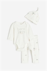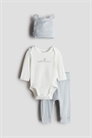 Комплект из комбинезона, брюк и аксессуаров из супермягкого хлопкового джерси. Боди-комбинезон с круглым вырезом, длинными рукавами и кнопками внизу для удобства переодевания. Сборчатые швы вокруг ножек для более удобного и плотного прилегания подгузника. Брюки со складками на талии и манжетами на подоле.
