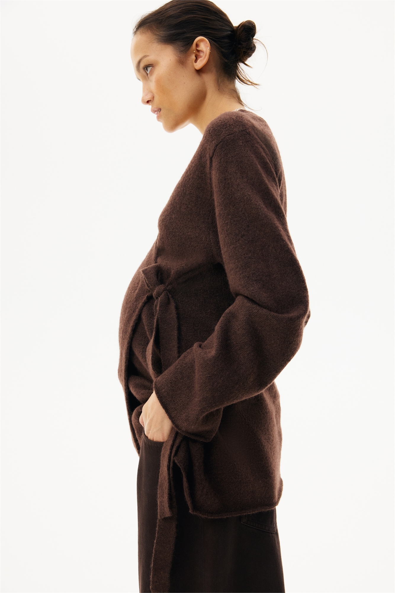 Кардиган из мягкого тонкого трикотажа с добавлением шерсти с завязками с одной стороны и потайными завязками с другой. Спущенные плечи, длинные рукава и завязки на манжетах и подоле. Можно носить как во время беременности, так и во время кормления грудью.