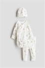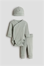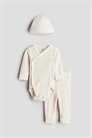Комплект из мягкого хлопкового трикотажа, предназначенный для роста вашего ребенка, включает в себя боди, брюки и пинетки. Боди с длинными рукавами, с завязками по бокам и двумя рядами завязок внизу для регулировки длины. Удлиненные манжеты, которые можно отгибать по мере роста ребенка, и сборчатые швы вокруг ножек для более удобного и плотного прилегания к подгузнику. Брюки с широкой складчатой панелью на талии и удлиненными манжетами по краям. Пинетки с отворотом на подоле.