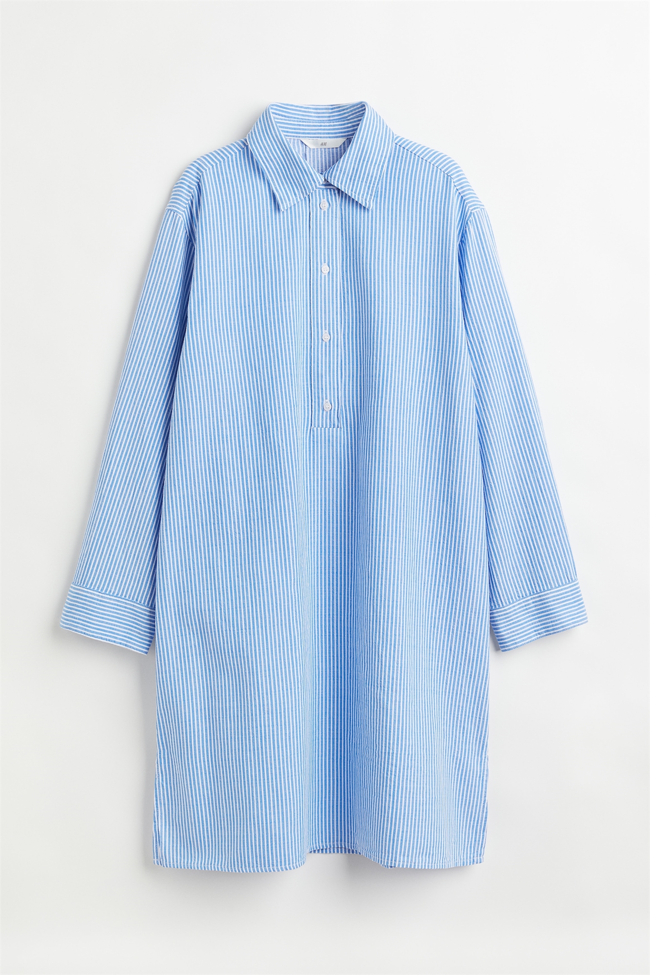Хлопковое платье длиной до колена с воротником и короткой пуговичной застежкой. Спущенные плечи и длинные рукава с манжетами на пуговицах. Коробчатая складка сзади придает дополнительную ширину. Разрезы по бокам. Без отделки.