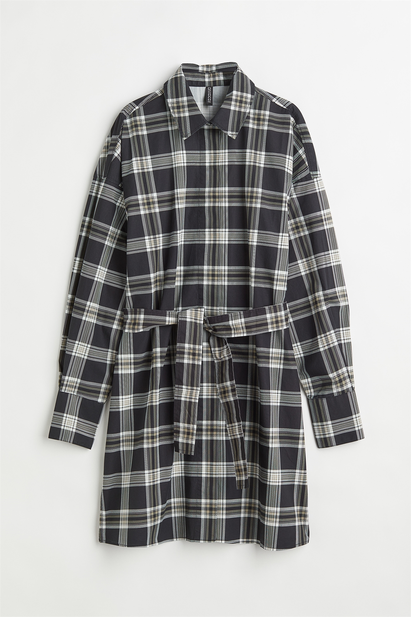 Платье-рубашка из хлопкового полотна с отложным воротником, потайными пуговицами спереди, низко опущенными плечами и длинными рукавами с манжетами на пуговицах. Съемный пояс с галстуком на талии.
