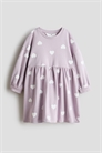 Платье оверсайз из мягкой толстовочной ткани с окантовкой по вырезу горловины и длинными, слегка расширенными рукавами с окантованными манжетами. Шов на бедрах для придания подолу дополнительной ширины.