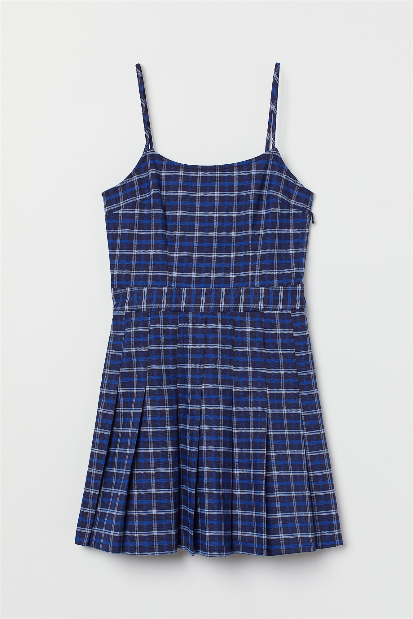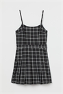 Короткое приталенное платье из эластичного полотна с узкими бретелями и потайной застежкой-молнией с одной стороны. Приталенное, со вставкой на поясе, и расклешенной юбкой со складками. Без подкладки.