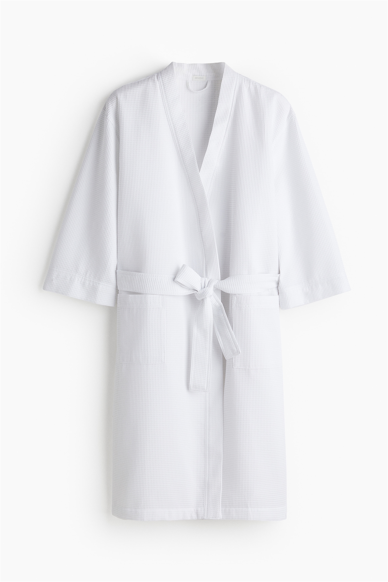 Халат из мягкого хлопкового материала с вафельным плетением, двумя передними карманами и поясом-завязкой на талии.