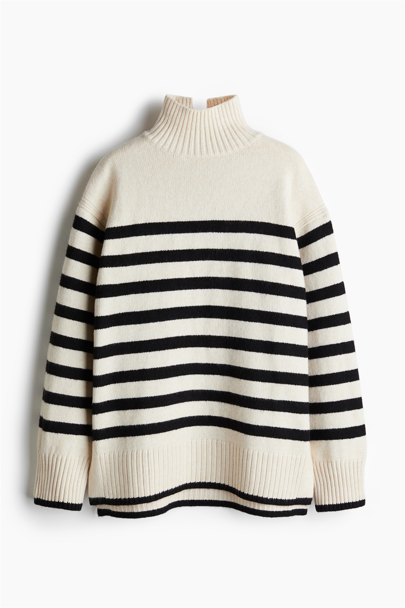 Джемпер оверсайз из мягкого трикотажа с добавлением шерсти. Ребристая горловина-поло и V-образная пройма сзади на шее. Спущенные плечи и длинные, широкие рукава. Ребрышки на манжетах и подоле, высокие разрезы по бокам.