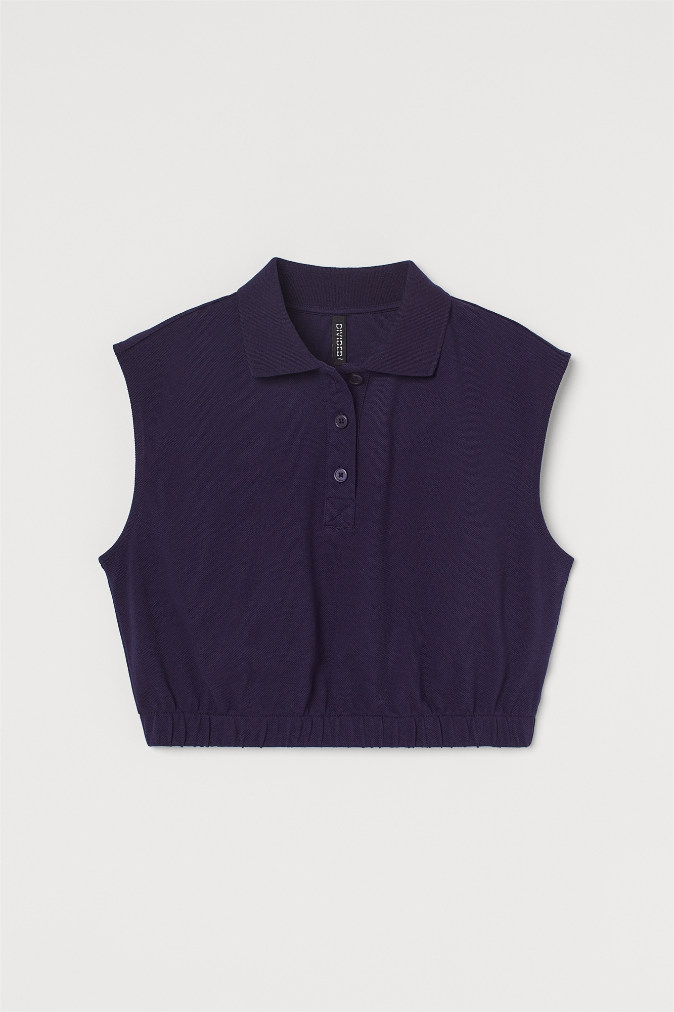 Обрезанная рубашка-поло без рукавов из хлопкового пике с ребристым воротником, застежкой на пуговицах и широкими эластичными вставками на подоле.