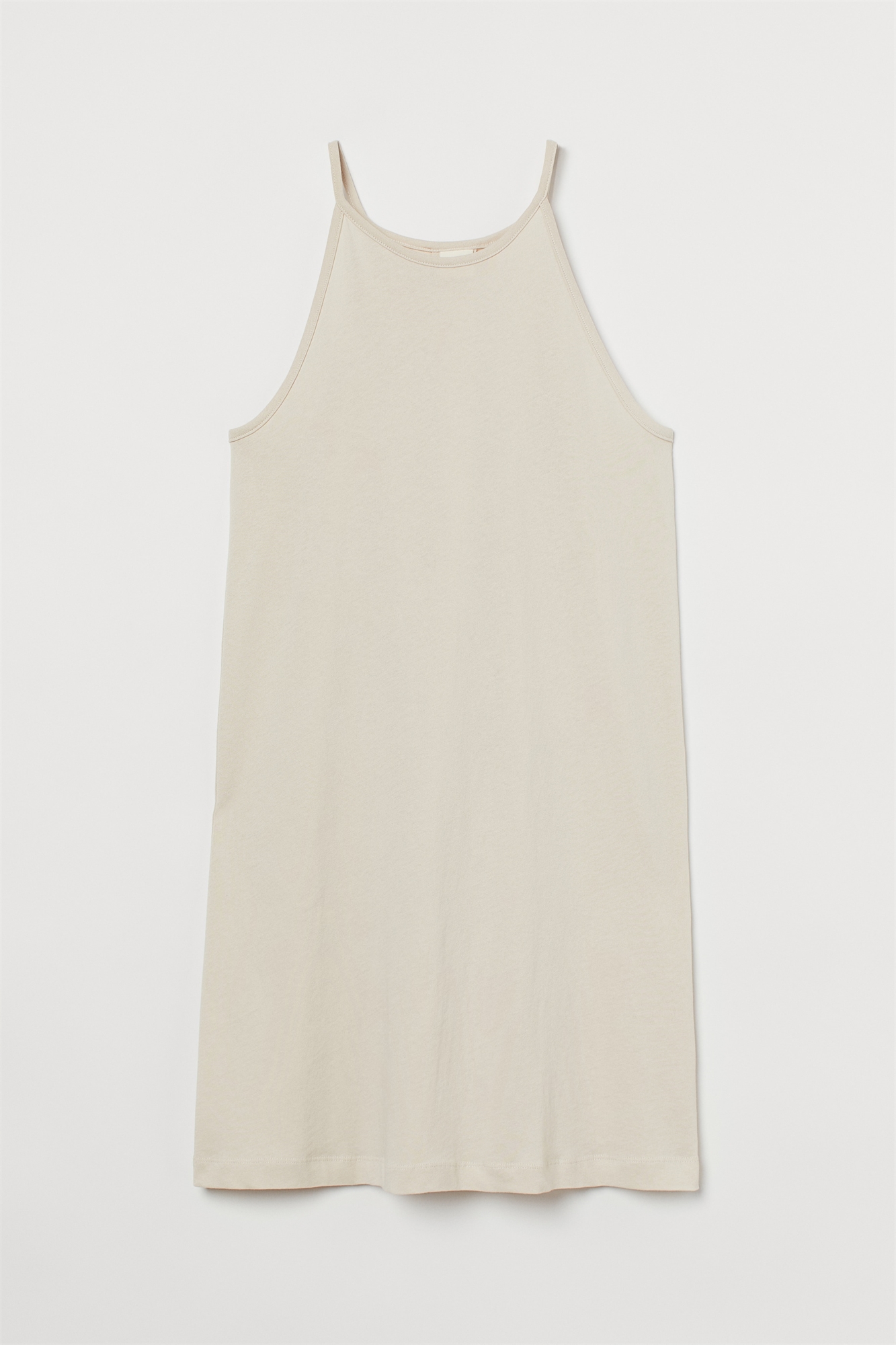 Короткое платье из мягкого хлопкового джерси. Узкие бретели, узкий разрез сверху и складки сзади. Без подкладки.