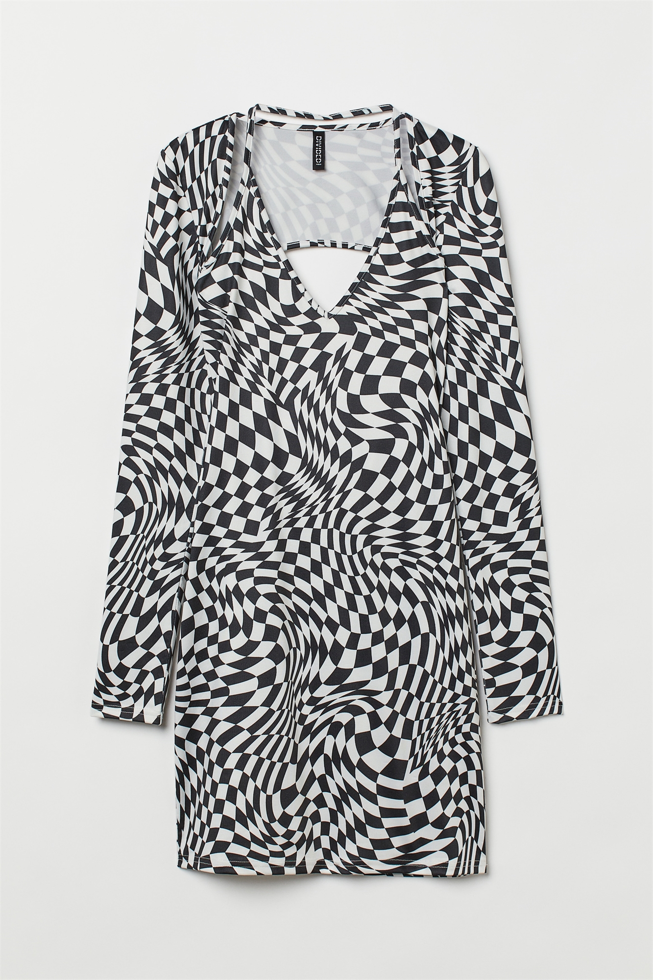 Короткое приталенное платье с V-образным вырезом из джерси с пришитым болеро. Вырез на груди, длинные рукава и пройма сзади.
