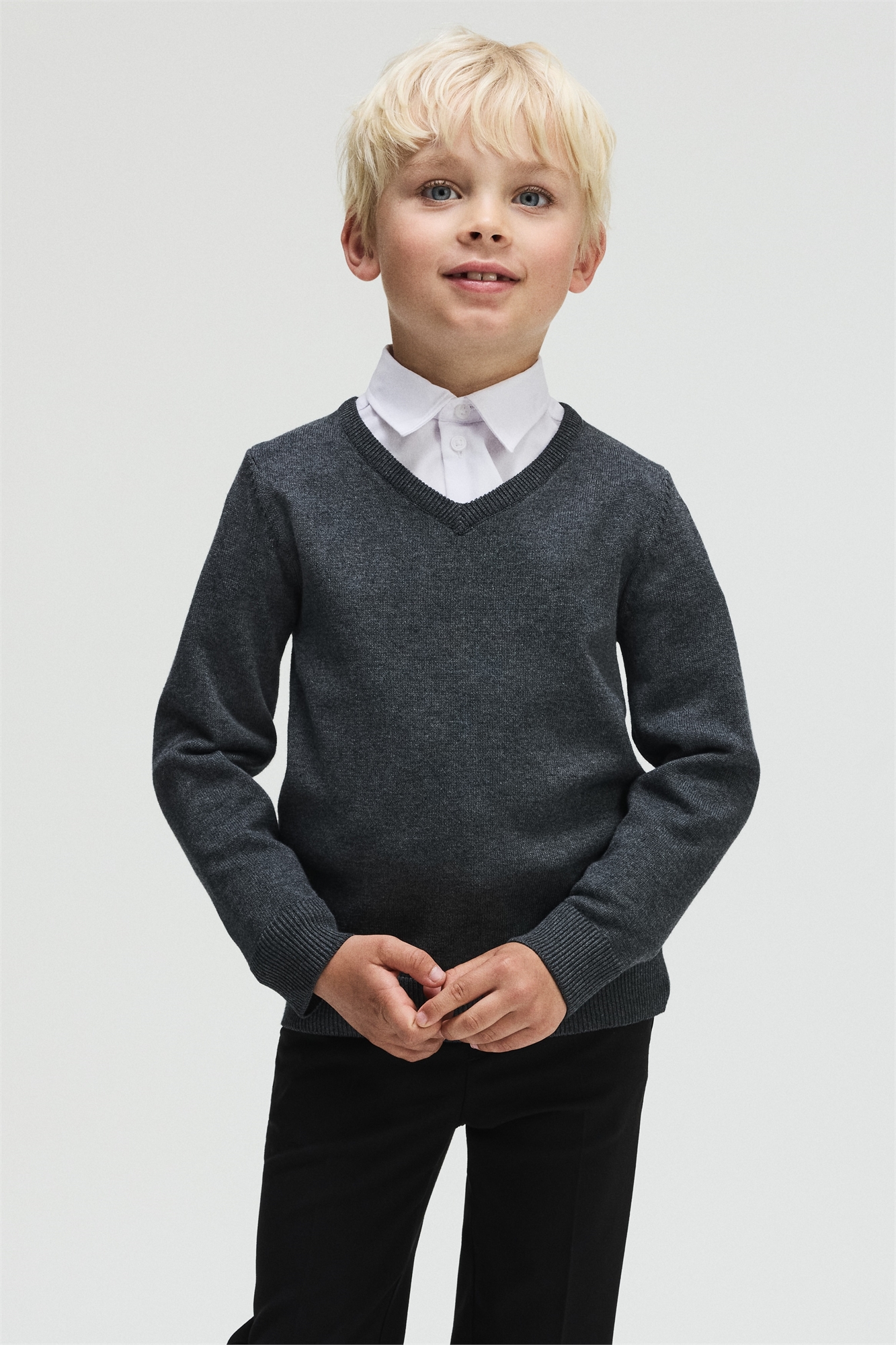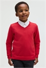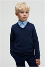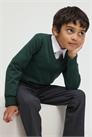 Школьный джемпер с V-образным вырезом из мягкого хлопка тонкой вязки с отделкой в рубчик по вырезу горловины, манжетам и подолу.