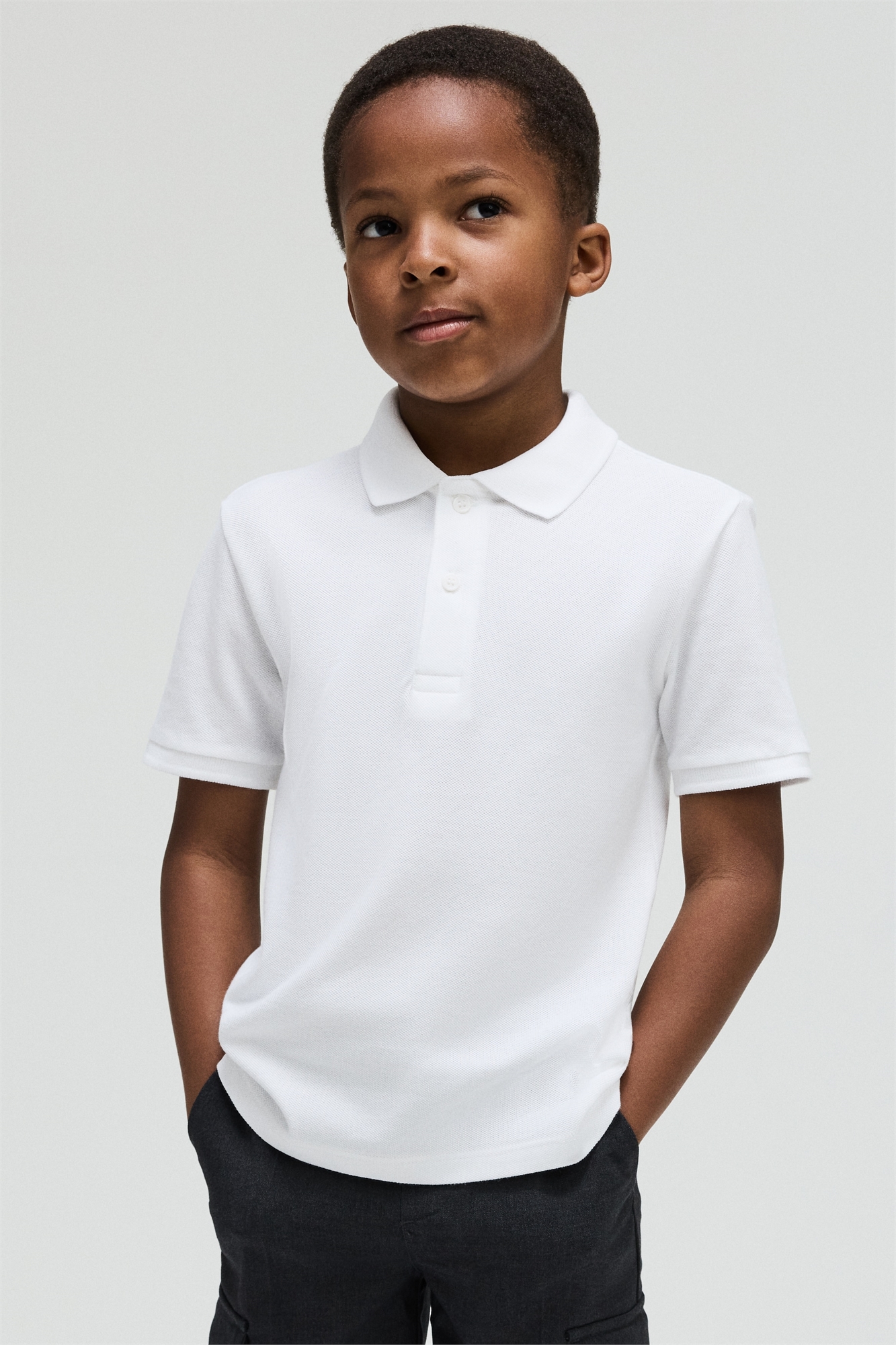 Рубашка-поло из хлопкового пике с ребристым воротником, застежкой на пуговицах, короткими рукавами с ребристой отделкой и короткими разрезами по бокам.