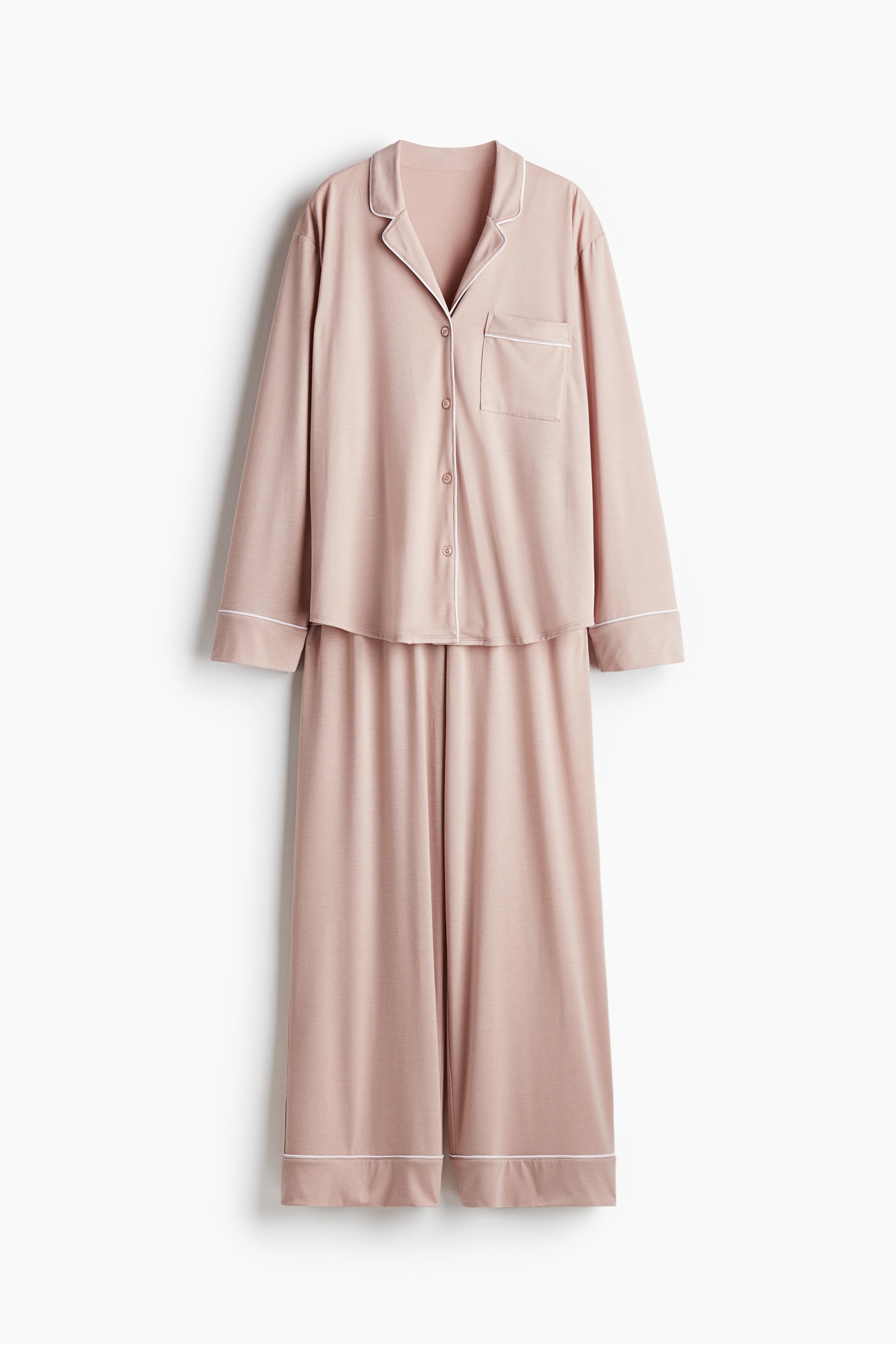 Пижама с рубашкой с длинными рукавами и нижними штанишками из мягкого трикотажа, изготовленного из смеси вискозы. Рубашка с отворотами и пуговицами спереди. Нижние штанины с эластичной резинкой на талии и широкими прямыми штанинами.
