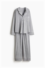 Пижама с рубашкой с длинными рукавами и нижними штанишками из мягкого трикотажа, изготовленного из смеси вискозы. Рубашка с отворотами и пуговицами спереди. Нижние штанины с эластичной резинкой на талии и широкими прямыми штанинами.