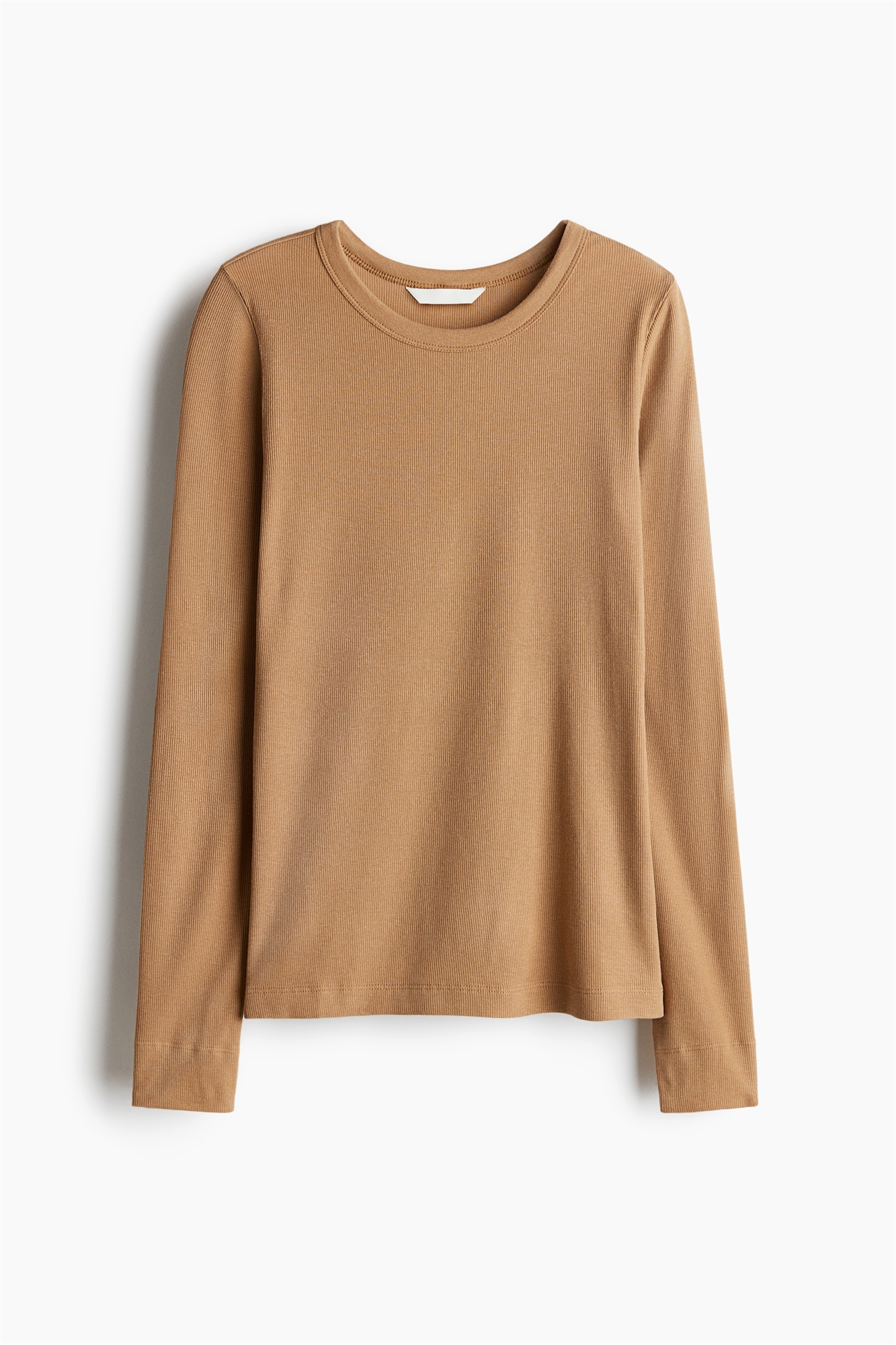 Облегающий топ из мягкого ребристого трикотажа из смеси хлопка с круглым вырезом и длинными рукавами.