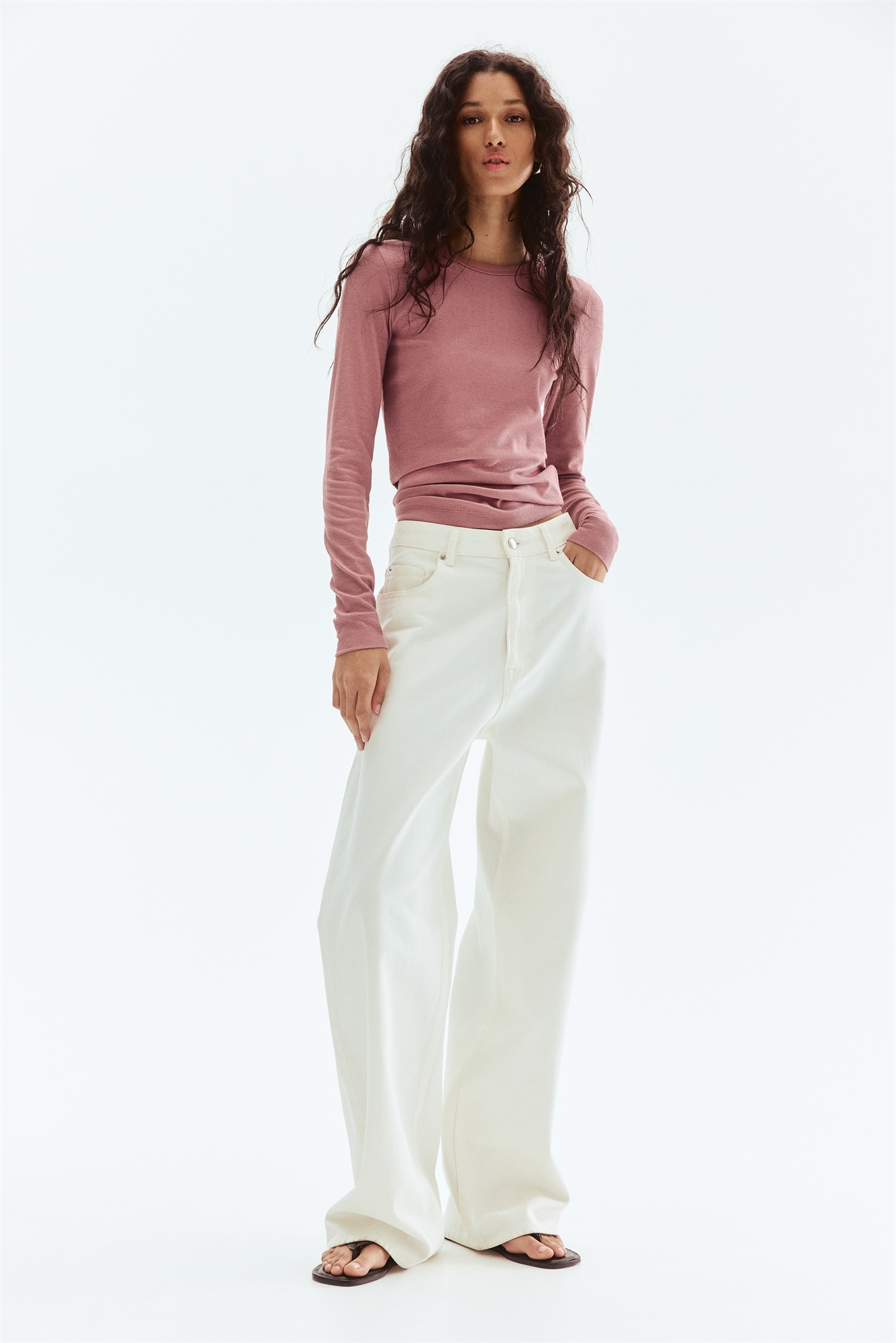 Облегающий топ из мягкого ребристого трикотажа из смеси хлопка с круглым вырезом и длинными рукавами.