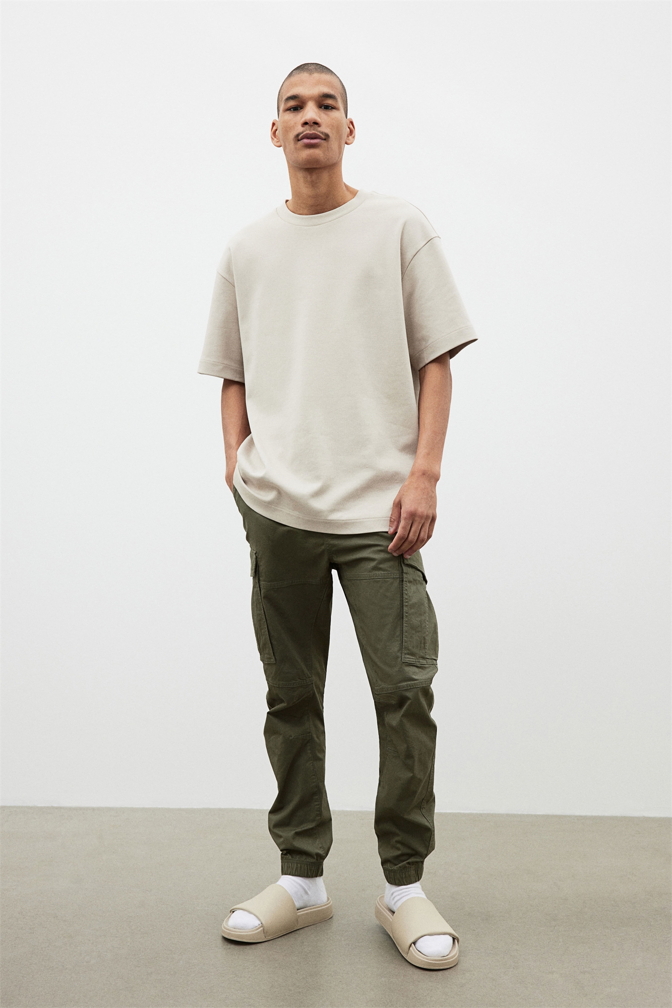 Джоггеры из хлопкового полотна с эластичной отделкой и утягивающим шнурком на талии, фальшивой ширинкой, диагональными боковыми карманами и накладными задними и ножными карманами с потайными кнопками. Зауженные ноги со швами и вытачками на коленях, а также с эластичной вставкой по краям.