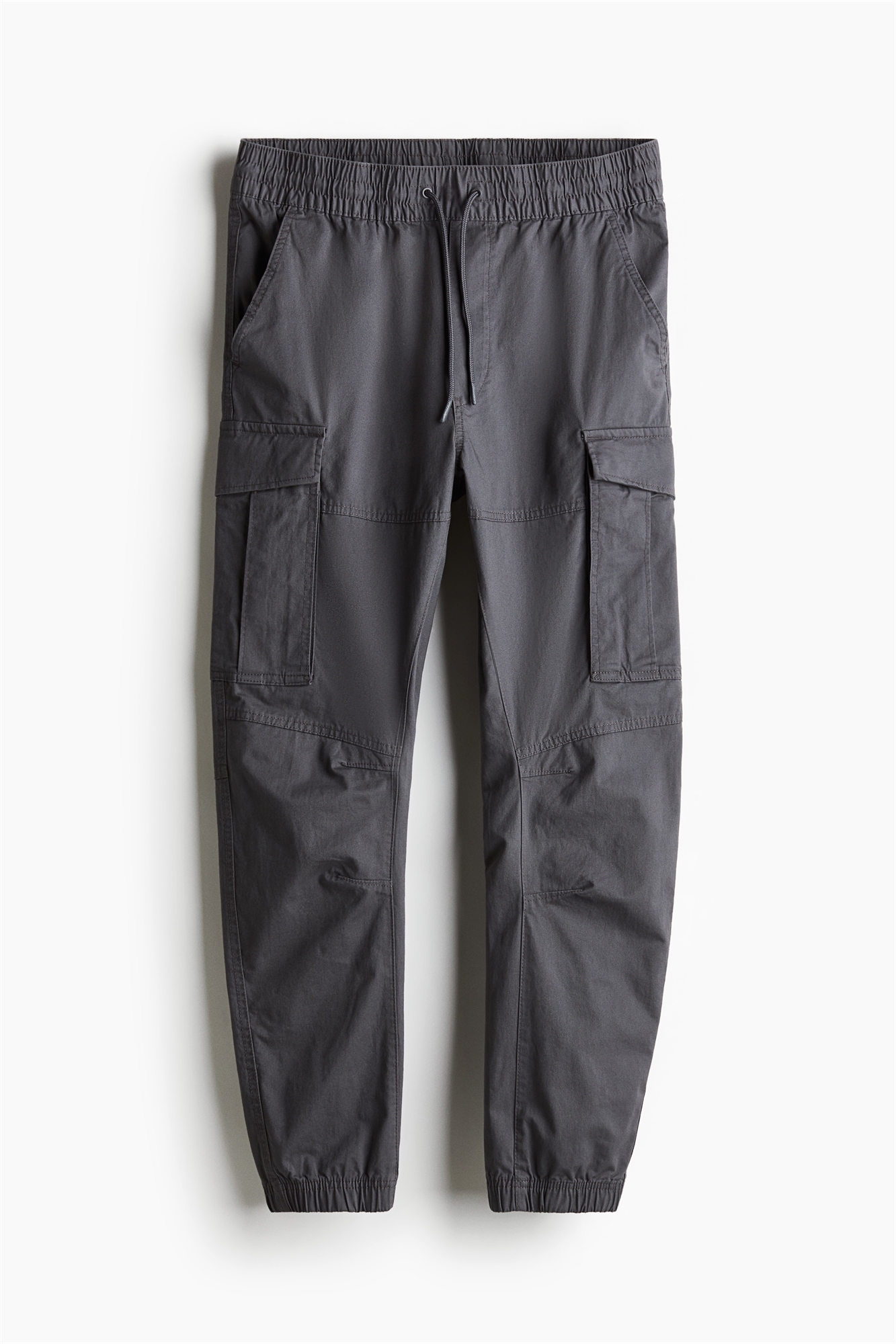 Джоггеры из хлопкового полотна с эластичной отделкой и утягивающим шнурком на талии, фальшивой ширинкой, диагональными боковыми карманами и накладными задними и ножными карманами с потайными кнопками. Зауженные ноги со швами и вытачками на коленях, а также с эластичной вставкой по краям.