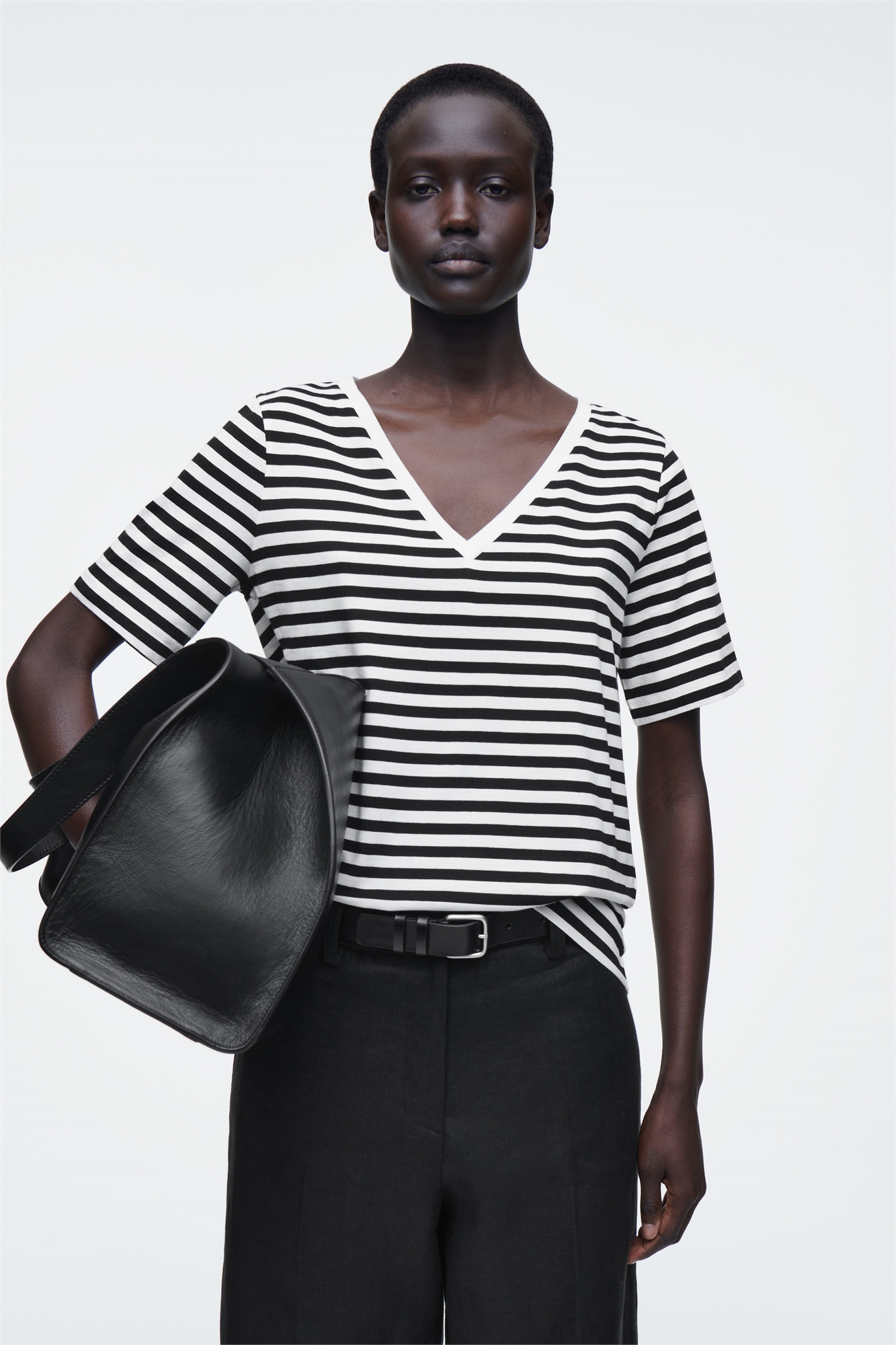 Качественные футболки являются краеугольным камнем коллекции COS с самого первого дня. Эта футболка из мягкого джерси из органического хлопка в классическую черную полоску в бретонском стиле - предмет первой необходимости. Футболка имеет плотный V-образный вырез и аккуратную строчку по краям. Regular fit, 150gsm Короткие рукава Органический хлопок выращен из негенетически модифицированных семян без использования химических удобрений и пестицидов Ткань: 100% органический хлопок. Без учета отделки / Машинная стирка Длина по спинке размера S составляет 62,5 см / Модель носит размер S