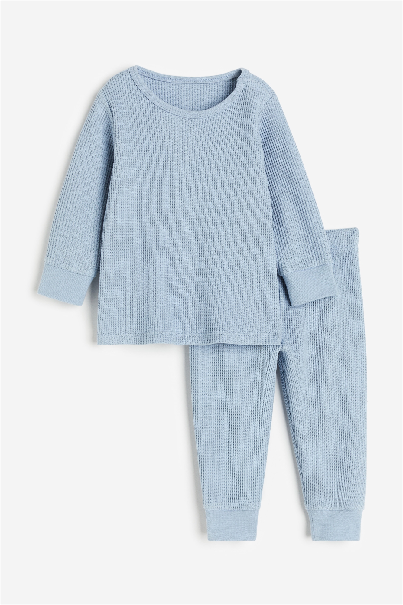 Уютный комплект из мягкого вафельного хлопкового джерси, состоящий из топа и брюк. Топ с длинными рукавами, скрытой застежкой на одном плече (кроме размеров 2-4Y) и тесемками по вырезу и манжетам. Брюки с потайной резинкой и утягивающим шнурком на талии, а также ребристые манжеты.