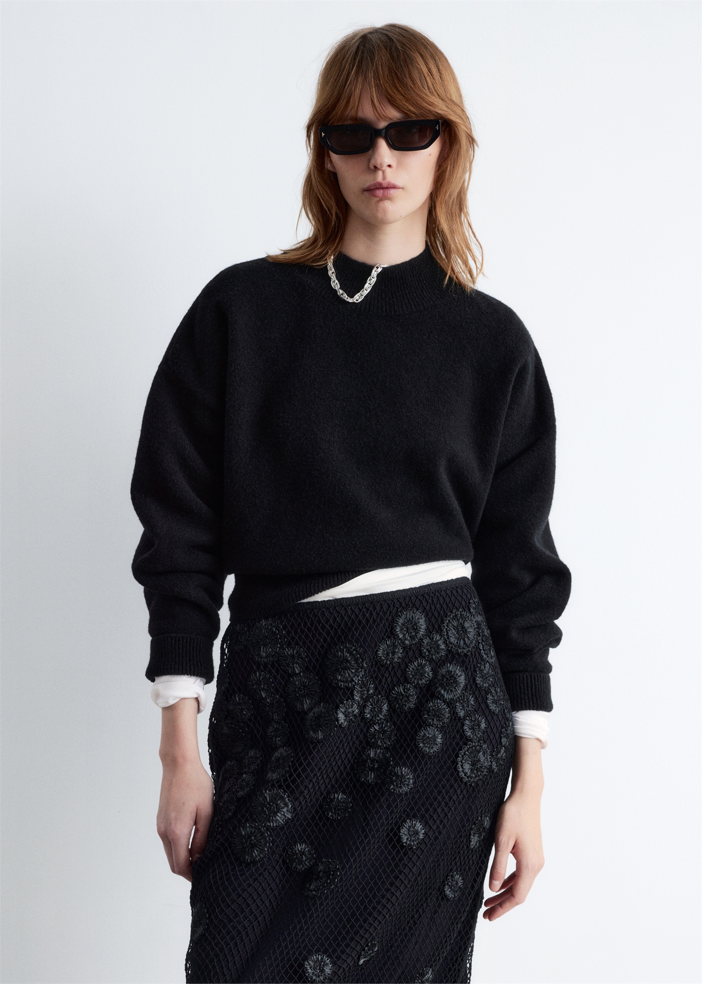 Трикотажный свитер с вырезом под мокасины, спущенными плечами и прямым силуэтом. • Ребристый вырез, манжеты и подол • Длина свитера: 50 см / 19,7” (размер S)